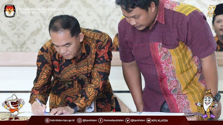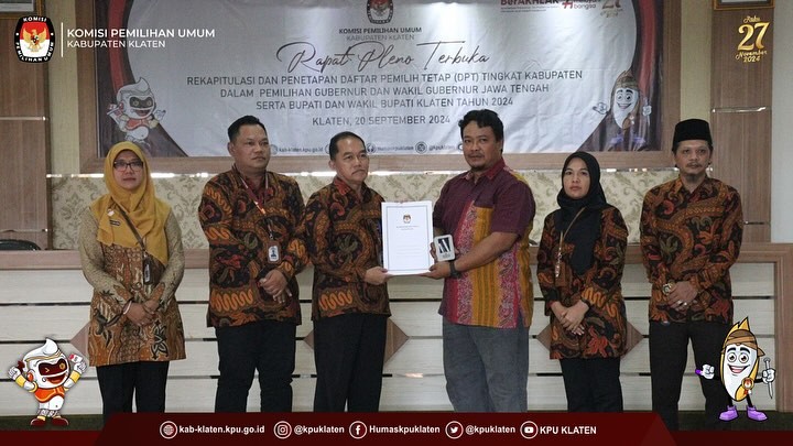KLATEN - #temanpemilih, KPU Kabupaten Klaten melaksanakan Rekapitulasi dan Penetapan Daftar Pemilih Tetap untuk Pemilihan Gubernur dan Wakil Gubernur, serta Bupati dan Wakil Bupati Klaten Tahun 2024, hari ini, Jumat (20/9). Bertempat di aula Kantor KPU Kabupaten Klaten, acara dihadiri oleh segenap tamu undangan, diantaranya Jajaran Forkopimda, Kepala Dinas/Instansi terkait, Bawaslu Kabupaten Klaten, Tim Bakal Pasangan Calon, serta Ketua dan Anggota PPK Divisi Datin se-Kabupaten Klaten. Disiarkan secara langsung via Youtube KPU Klaten, rapat pleno terbuka dipimpin secara langsung oleh Ketua KPU Klaten, Ir. Primus Supriono, S.T.P., Selanjutnya dibacakan tata tertib rapat pleno terbuka oleh Anggota KPU Klaten divisi teknis, Herlis Setiyanik, S.Sos., M.A. Setelah itu, anggota KPU Klaten Divisi Data dan Informasi, David Indrawan, S.Pt. membacakan rekapitulasi daftar pemilih tetap untuk 26 kecamatan se-Kabupaten Klaten, sehingga didapatkan total jumlah pemilih sebanyak 973.342, dengan rincian jumlah pemilih laki-laki sebanyak 479.139 dan pemilih perempuan sebanyak 494.203, yang tersebar di 2025 TPS dan 401 desa/kelurahan se-Kabupaten Klaten.
