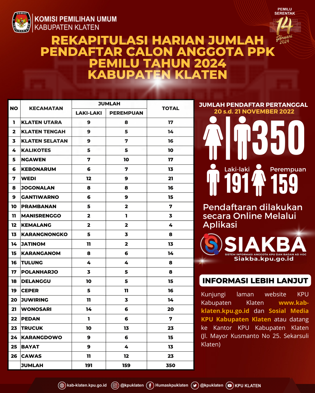 Klaten - Selasa (21/11) Rekap Jumlah Pendaftar Calon Anggota PPK Pemilu Tahun 2024 berjumlah 350 Pendaftar dengan rincian Pendaftar Laki-Laki berjumlah 191 dan Pendaftar Perempuan 159 Pendaftar. Data diambil pada tanggal 21 November 2022 pada pukul 16.30 WIB.