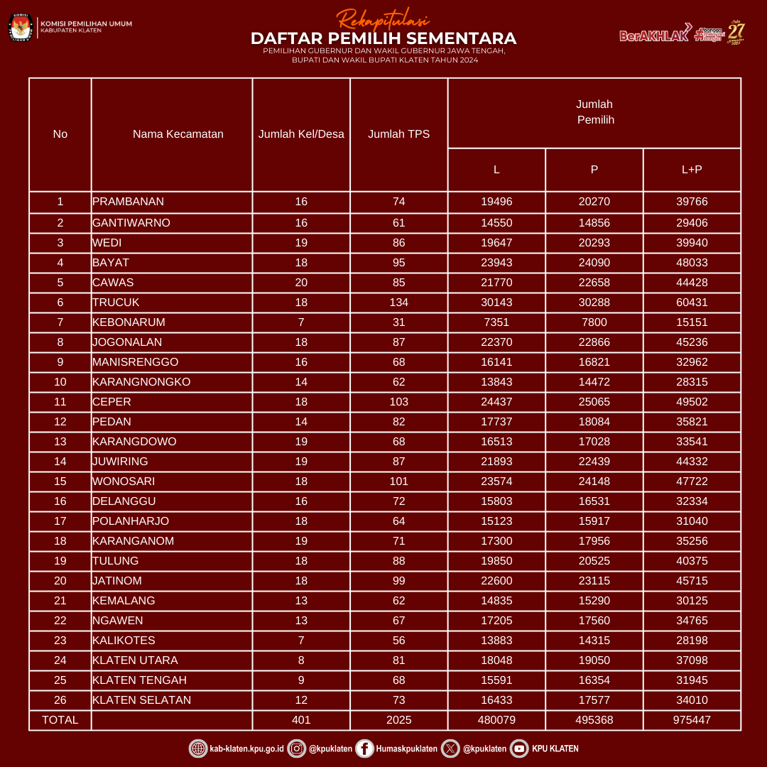 Rekapitulasi Daftar Pemilih Sementara tingkat Kabupaten Klaten Senin, 12 Agustus 2024 08:00 177 SK PENETAPAN DPS TINGKAT KABUPATEN KLATEN Bagikan: Telah dilihat 177 kali