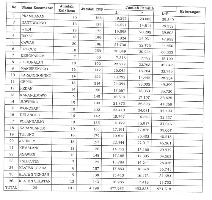 Berdasarkan Rapat Pleno Terbuka Rekapitulasi dan Penetapan Daftar Pemilih Tetap (DPT) Tingkat Kabupaten Klaten Pemilu Tahun 2024 ditetapkan sebagai berikut: