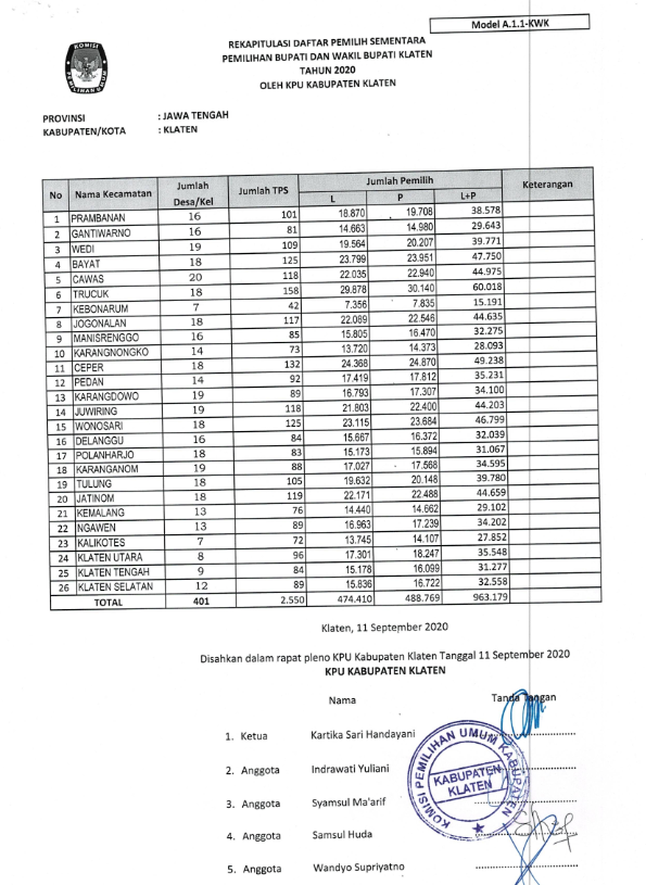 Komisi Pemilihan Umum Kabupaten Klaten menetapkan Rekapitulasi dan Penetapan Daftar Pemilih Sementara Pemilihan Bupati dan Wakil Bupati Klaten 2020 sebagaimana tertuangan dalam Beria Acara Nomor 43/PL.02.1-BA/KPU-Kab/IX/2020 [DOWNLOAD]