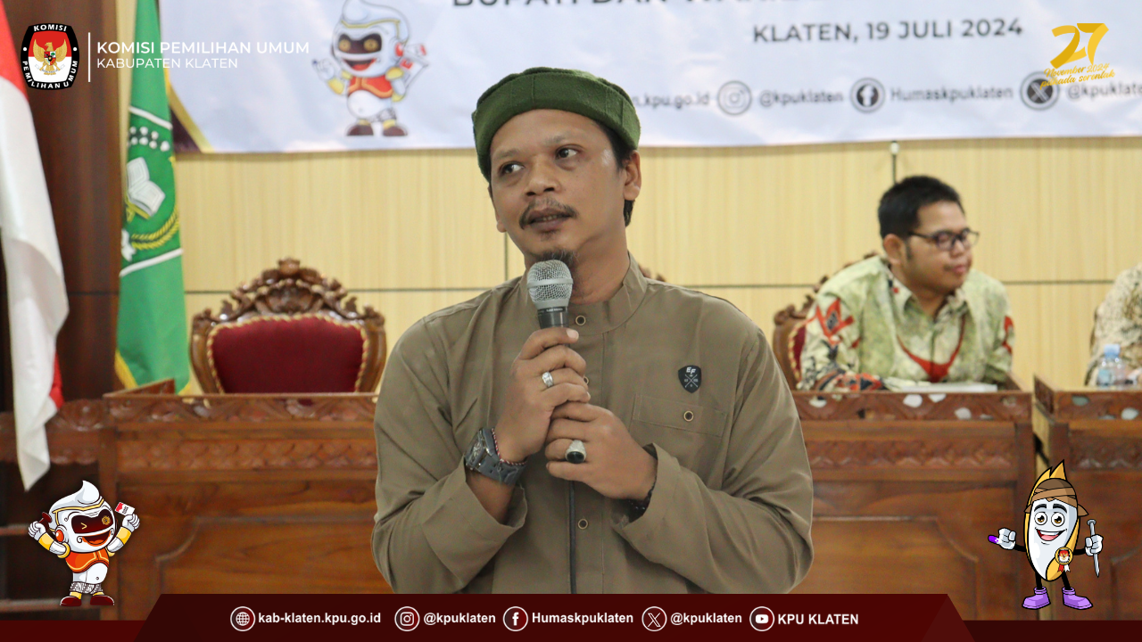 #TemanPemilih Hari ini Jumat, 19 Juli 2024 Komisi Pemilihan Umum Kabupaten Klaten menyelenggarakan kegiatan Sosialisasi dan Pendidikan Pemilih kepada Pengurus Pesantren Se Kabupaten Klaten untuk Pemilihan Gubernur dan Wakil Gubernur Jawa Tengah, Bupati dan Wakil Bupati Klaten Tahun 2024 bertempat di Aula Al Ikhlas Kantor Kemenag Kabupaten Klaten, dihadiri oleh kepala Kemenag, dan 108 Orang Peserta yang merupakan Perwakilan dari 54 Pondok Pesantren se Kabupaten Klaten.