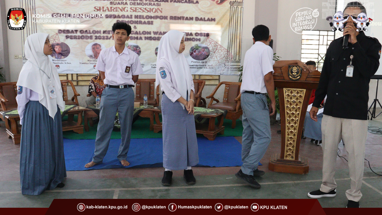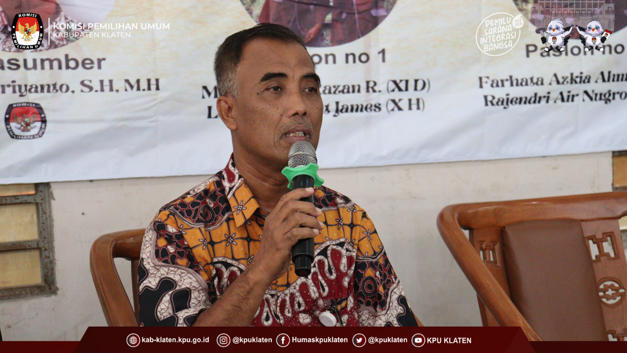 #TemanPemilih Anggota KPU Kabupaten Klaten Divisi Sosdiklih Parmas dan SDM Bapak Wandyo Supriyatno, S.H.,M.H. mengisi kegiatan Sosialisasi Pendidikan Pemilih kepada SMA N 1 Jatinom,kegiatan tersebut dilaksanakan pada hari Rabu, 20 September 2023.