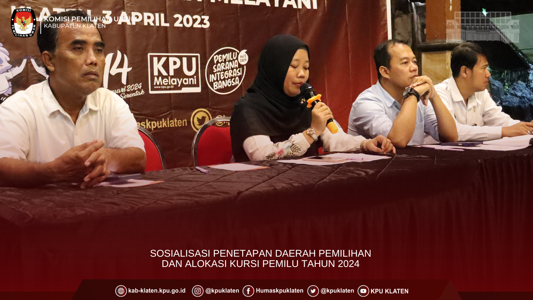 Dalam kegiatan ini dibuka oleh Ketua KPU Kabupaten klaten Kartika Sari Handayani, dan dilanjutkan materi oleh Kadiv. Teknis Penyelenggaraan Pemilu KPU Kabupaten Klaten, Samsul Huda menyampaikan bahwa Dapil DPRD Kabupaten Klaten telah ditetapkan KPU RI pada tanggal 9 Februari 2023. Dapil menjadi dasar bagi partai politik untuk menentukan siapa yang diajukan sebagai caleg. dan beliau juga menyampaikan bahwa untuk menentukan suatu dapil KPU mengedepankan 7 prinsip, diantaranya kesetaraan nilai suara, ketaatan pada sistem pemilu yang proporsional, proporsionalitas, integralitas wilayah, berada dalam cakupan wilayah yang sama, serta kohesivitas dan kesinambungan.