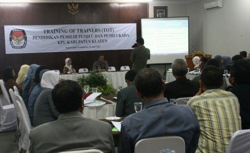 Sebanyak 59 guru guru Pendidikan Kewarganegaraan (PKn) tingkat SMA, dan SMK dan 11 orang staf sekretariat KPU Kabupaten Klaten, selama sehari penuh mengikuti kegiatan Training Of Trainers (TOT) yang bertujuan untuk meningkatkan partisipasi masyarakat terutama pemilih pemula. Dalam acara ini, terungkap beberapa faktor yang mempengaruhi menurunnya partisipasi pemilih untuk menyampaikan hak pilihnya dalam pemilu maupun pemilukada adalah perilaku politisi partai politik yang tersandung kasus korupsi, juga munculnya konflik yang terjadi antar partai politik. Hal penting yang ditekankan adalah bagaimana menjadi pemilih yang cerdas dalam nmenggunakan hak pilihnya diTPS.