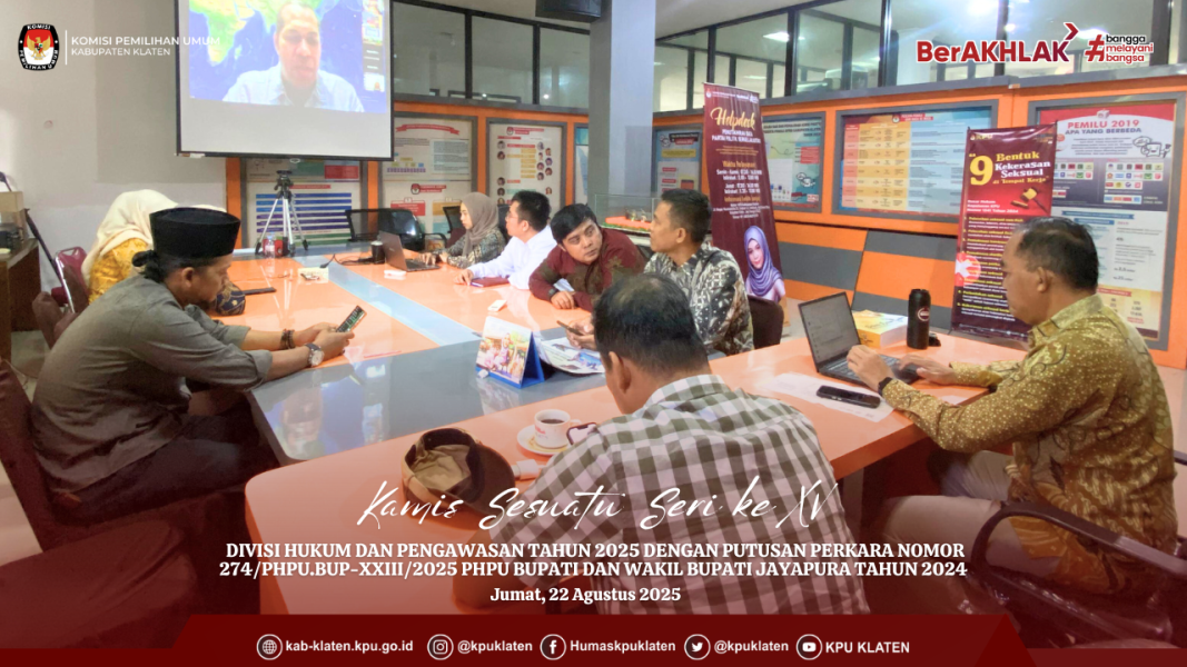 Dengan mengusung semangat perbaikan nilai-nilai demokrasi pada penyelenggaraan Pemilu dan Pilkada yang akan datang, pendidikan politik bagi pemilih dan masyarakat secara luas menjadi hal yang niscaya. Oleh karena itu, KPU Kabupaten Klaten menyelenggarakan sosialisasi hasil Pilkada Klaten Tahun 2024 dan pendidikan pemilih di lima Dapil Kabupaten Klaten. KLATEN - #temanpemilih, Kegiatan pertama sosialisasi hasil Pilkada dan pendidikan pemilih bagi masyarakat Klaten di wilayah Dapil Klaten 1 berlangsung, Rabu (12/3) di Pendapa Pemda Klaten. Bupati Klaten Hamenang Wajar Ismoyo dan Ketua Divisi Teknis Penyelenggaraan KPU Provinsi Jawa Tengah Muhammad Machruz turut hadir memberikan sambutan. Hadir pula Kajari Klaten, Polres Klaten, dan Kesbangpol Klaten sebagai narasumber. Hadir sebagai peserta segenap dinas/instansi terkait, Bawaslu, camat, kades/lurah, ormas, BPD, pimpinan perguruan tinggi, siswa, mahasiswa, hingga PKK dan Karang Taruna tingkat kecamatan se-Dapil Klaten 1. Kegiatan ini sebagai sarana bagi KPU Kabupaten Klaten untuk menyampaikan hasil dan evaluasi tahapan Pilkada Tahun 2024 di Kabupaten Klaten kepada masyarakat. Kegiatan dibuka dengan sambutan dari Ketua KPU Klaten, Primus Supriono. Dalam sambutannya, Primus mengungkapkan bahwa Pilkada Klaten 2024 mengusung semangat Pilkada inklusif, yang kemudian diwujudkan dengan memberikan perhatian khusus pada proses pendataan penyandang disabilitas dan kelompok marginal, memberikan fasilitas rekam e-KTP bagi pemilih pemula, serta melaksanakan sosialisasi dan pendidikan pemilih. “Selain itu, untuk meningkatkan daya tarik Pilkada dan partisipasi masyarakat, KPU Klaten juga menyelenggarakan berbagai lomba kreativitas seperti lomba paduan suara jingle Pilbup, lomba penulisan artikel untuk pelajar dan mahasiswa, lomba TPS tematik, serta lomba photobooth di 2.025 TPS. Tak sia-sia, ternyata usaha tersebut membuahkan hasil berupa tingkat partisipasi masyarakat sebesar 81,64%, yang merupakan terebaik ke-6 se-Jawa Tengah,” imbuh Primus. Pada kesempatan ini Bupati Klaten terpilih, Hamenang Wajar Ismoyo, dalam sambutannya mengutarakan pentingnya pendidikan politik bagi masyarakat. “Dari kegiatan ini, diharapkan goals-nya adalah masyarakat yang semakin paham dengan politik. Pada akhirnya, masyarakat sebagai pemilih pun akan menjadi cerdas dalam menentukan pilihan politiknya”, katanya. Sementara itu, dalam sambutannya, Ketua Divisi Teknis Penyelenggaraan KPU Provinsi Jawa Tengah Muhammad Machruz mengatakan, dengan segala dinamika, secara umum Pilkada di Provinsi Jawa Tengah dan Kabupaten Klaten berlangsung dengan baik dan sukses. Acara dilanjutkan dengan paparan materi sosialisasi dan pendidikan pemilih. Ketua Divisi Sosialisasi, Pendidikan Pemilih, Partisipasi Masyarakat dan SDM KPU Klaten, Muhammad Ansori, memfasilitasi sesi materi dengan menghadirkan narasumber Kepala Kejaksaan Negeri Klaten, Faizal Banu, S.H., M.Hum. yang memaparkan tentang kesadaran hukum dalam kehidupan berpolitik, Kepala Badan Kesbangpol Klaten Sugeng Haryanto, S.E., M.M. dengan materi seputar budaya, etika dan pendidikan politik dalam proses demokrasi, serta KBO Sat Intelkam Ipda Jendro Harmadi, SH dari Polres Klaten yang memaparkan tentang demokrasi dan keterlibatan masyarakat. *** (Vit)