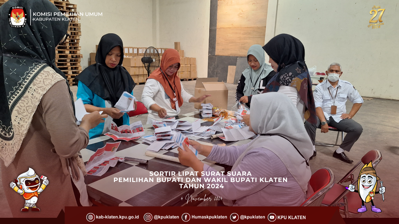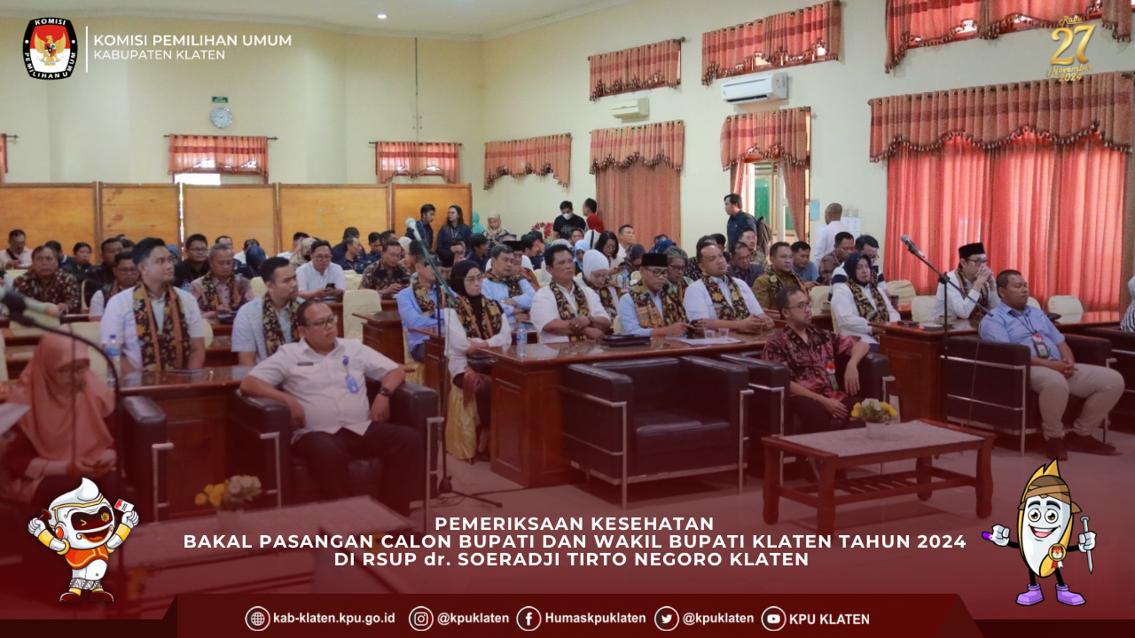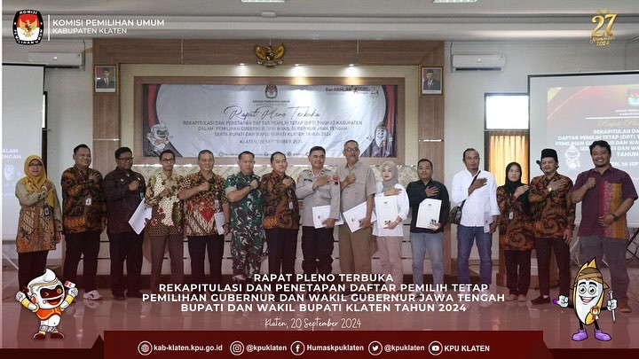 KLATEN - #temanpemilih, KPU Kabupaten Klaten melaksanakan Rekapitulasi dan Penetapan Daftar Pemilih Tetap untuk Pemilihan Gubernur dan Wakil Gubernur, serta Bupati dan Wakil Bupati Klaten Tahun 2024, hari ini, Jumat (20/9). Bertempat di aula Kantor KPU Kabupaten Klaten, acara dihadiri oleh segenap tamu undangan, diantaranya Jajaran Forkopimda, Kepala Dinas/Instansi terkait, Bawaslu Kabupaten Klaten, Tim Bakal Pasangan Calon, serta Ketua dan Anggota PPK Divisi Datin se-Kabupaten Klaten. Disiarkan secara langsung via Youtube KPU Klaten, rapat pleno terbuka dipimpin secara langsung oleh Ketua KPU Klaten, Ir. Primus Supriono, S.T.P., Selanjutnya dibacakan tata tertib rapat pleno terbuka oleh Anggota KPU Klaten divisi teknis, Herlis Setiyanik, S.Sos., M.A. Setelah itu, anggota KPU Klaten Divisi Data dan Informasi, David Indrawan, S.Pt. membacakan rekapitulasi daftar pemilih tetap untuk 26 kecamatan se-Kabupaten Klaten, sehingga didapatkan total jumlah pemilih sebanyak 973.342, dengan rincian jumlah pemilih laki-laki sebanyak 479.139 dan pemilih perempuan sebanyak 494.203, yang tersebar di 2025 TPS dan 401 desa/kelurahan se-Kabupaten Klaten.