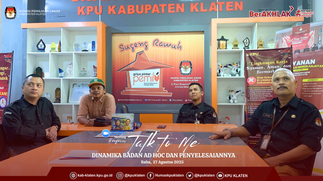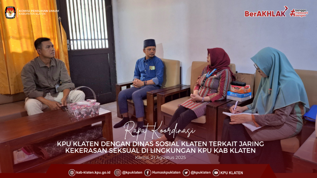 KLATEN – #temanpemilih KPU Kabupaten Klaten kembali menyelenggarakan program BU KAJI (Rabu Mengkaji) Seri ke-3, kali ini mengambil tema “Sosialisasi Pencegahan Kekerasan Seksual di Lingkungan Kerja”, Rabu (27/8).