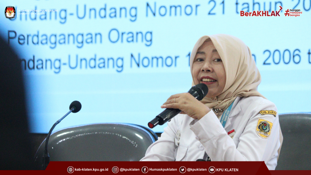 Pemaparan materi selanjutnya dipandu oleh Muhammad Ansori, Ketua Divisi Sosdiklih Parmas dan SDM KPU Klaten, dengan menghadirkan narasumber Setyowati, S.Sos, Kepala Bidang Pemberdayaan Perempuan dan Perlindungan Anak (PPPA) pada Dinas Sosial P3APPKB Kabupaten Klaten.