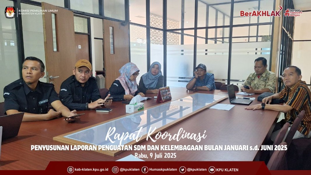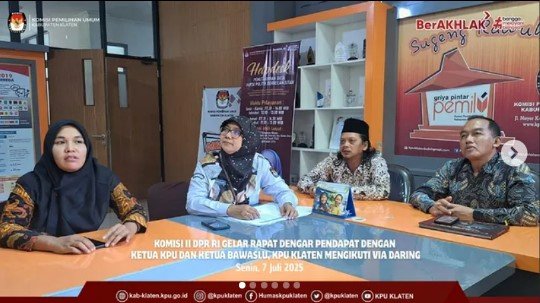 KLATEN – #temanpemilih KPU Kabupaten Klaten mengikuti Rapat Koordinasi Tindak Lanjut Pelaksanaan Kegiatan Pasca Pemilu dan Pemilihan yang diselenggarakan oleh KPU Provinsi Jawa Tengah, pada Rabu, (9/7/2025), secara daring melalui Zoom Meeting. Kegiatan ini merupakan tindak lanjut dari Surat Komisi Pemilihan Umum Republik Indonesia Nomor 1109/PL.01-SD/06/2025 tentang Penjelasan Pelaksanaan Kegiatan Pasca Pemilu dan Pemilihan. Rapat diikuti oleh jajaran KPU Kabupaten/Kota se-Jawa Tengah, termasuk KPU Klaten, yang diwakili oleh Ketua Divisi Teknis Penyelenggaraan, Herlis Setiyanik, Kepala Subbagian Teknis dan Hukum, Budi Sambodo, serta Staf Teknis, sesuai dengan ketentuan peserta yang ditetapkan oleh KPU Provinsi. Rapat bertujuan untuk menyampaikan arahan, kebijakan, serta penjelasan teknis mengenai pelaksanaan program kelembagaan yang harus dijalankan setelah selesainya tahapan Pemilu dan Pemilihan. Selain itu, kegiatan ini juga menjadi forum koordinasi untuk menyamakan persepsi dan menyelaraskan langkah antar satuan kerja di lingkungan KPU Provinsi Jawa Tengah dan KPU Kabupaten/Kota. KPU Provinsi Jawa Tengah menegaskan pentingnya kesinambungan program kelembagaan pasca pemilu yang dijalankan secara profesional, efisien, dan akuntabel. Koordinasi ini diharapkan dapat memperkuat kinerja kelembagaan serta menjaga integritas institusi penyelenggara pemilu di seluruh tingkatan. KPU Klaten berkomitmen untuk menindaklanjuti hasil rapat koordinasi ini dengan sebaik-baiknya dalam penyusunan dan pelaksanaan program pasca pemilu, sejalan dengan arah kebijakan nasional serta kebutuhan kelembagaan di tingkat kabupaten. #kpumelayani #kpuklaten