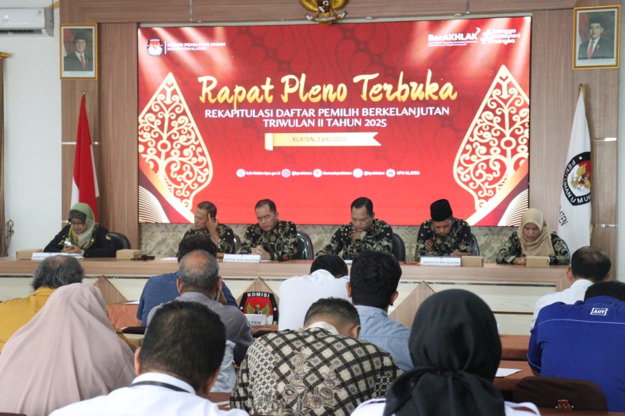 SEMARANG - #temanpemilih Setelah melalui proses sinkronisasi dan validasi Data PDPB Semester I 2025 di Tingkat Provinsi, pada hari ini dilaksanakan Rapat Pleno Terbula Rekapitulasi Daftar Pemilih Berkelanjutan (DPB) Semester I Tahun 2025 tingkat Provinsi Jawa Tengah, hari ini, Jumat (4/7). Bertempat di Aula Kantor KPU Provinsi Jawa Tengah, Semarang, kegiatan ini diikuti oleh Ketua Divisi Perencanaan, Data, dan Informasi KPU Kabupaten Klaten, David Indrawan, bersama Admin Sistem Informasi Data Pemilih (Sidalih), Andriyani. Rapat pleno dipimpin oleh Ketua KPU Provinsi Jawa Tengah, Handi Tri Ujiono. Selanjutnya dibacakan hasil rekapitulasi pemutakhiran data pemilih berkelanjutan di tingkat KPU Kabupaten/Kota se-Jawa Tengah. Rekapitulasi dibacakan secara langsung oleh Ketua Divisi Data dan Informasi, KPU Provinsi Jawa Tengah, Paulus Widiantoro. Sebagaimana telah ditetapkan dalam rapat pleno terbuka PDPB Tingkat KPU Kabupaten Klaten, bahwa jumlah pemilih di Kabupaten Klaten tercatat laki-laki sebanyak 477.196 dan perempuan 491.319, dengan total pemilih sebesar 968.515. Setelah dibacakan rekapitulasi untuk 35 kabupaten/kota se-Jawa Tengah, Paulus membacakan jumlah total rekapitulasi PDPB Semester I Tingkat Provinsi Jawa Tengah. Dari hasil pemutaklhiran data pemilih, diperoleh jumlah pemilih laki-laki sebanyak 14.223.360, Perempuan sebanyak 14.294.374, dan total pemilih sebanyak 28.517.734, yang tersebar di 8.563 kelurahan/desa dan 576 kecamatan se-Jawa Tengah. “Jumlah PDPB yang ditetapkan tersebut, jika dibandingkan dengan jumlah DPT Pilkada 2024 yang lalu, mengalami kenaikan sebanyak 90.118 pemilih. Data perubahan pemilih tersebut terdiri dari 217.237 jumlah pemilih baru, 112.200 jumlah perbaikan data pemilih, dan 126.617 jumlah pemilih tidak memenuhi syarat,” terang Paulus. Kegiatan ini merupakan bagian dari proses pemutakhiran data pemilih yang dilakukan secara berkelanjutan oleh KPU, guna memastikan bahwa setiap warga negara yang memiliki hak pilih tercatat secara valid dalam daftar pemilih. Rapat pleno ini juga menjadi momentum penting untuk mengevaluasi dan menyelaraskan data pemilih antarwilayah, menjelang tahapan pemilihan serentak berikutnya. (***andri/kpuklt)