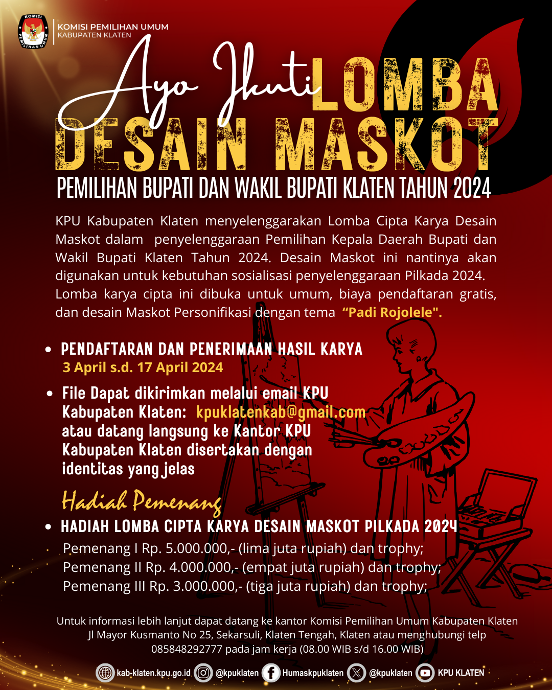 KPU Kabupaten Klaten menyelenggarakan Lomba Cipta Karya Desain Maskot dalam penyelenggaraan Pemilihan Kepala Daerah Bupati dan Wakil Bupati Klaten Tahun 2024. Desain Maskot ini nantinya akan digunakan untuk kebutuhan sosialisasi penyelenggaraan Pilkada 2024. Lomba karya cipta ini dibuka untuk umum, biaya pendaftaran gratis, dan desain Maskot Personifikasi dengan tema “Padi Rojolele".