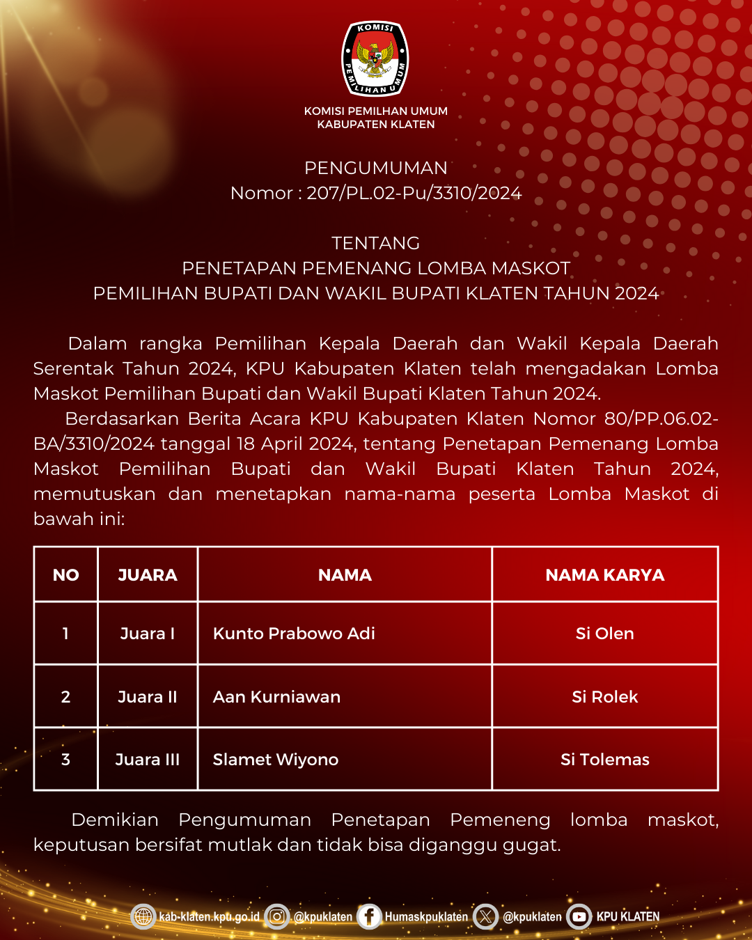 Pemenang lomba akan diumumkan melalui website dan/atau media sosial KPU Kabupaten Klaten dan/atau Pemenang lomba akan dihubungi KPU Kabupaten Klaten dalam bentuk surat tertulis serta diumumkan secara resmi pada acara lounching Pemilihan Bupati dan Wakil Bupati Klaten Tahun 2024;