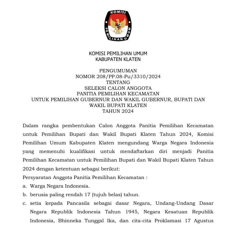 Peserta mendaftarkan diri secara langsung ke Komisi Pemilihan Umum Kabupaten Klaten dengan mengisi Formulir Pendaftaran yang dapat diunduh di website KPU Kabupaten Klaten (https://kab-klaten.kpu.go.id/);