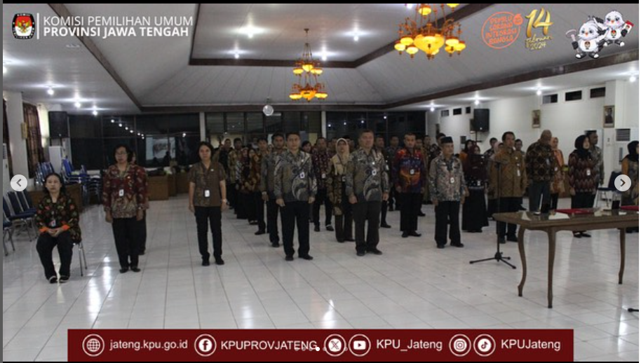 #TemanPemilih Semarang, 1 September 2023 - Sejumlah 78 orang dilantik menjadi Pejabat Administrasi dan Pejabat Fungsional di Lingkungan Sekretariat KPU Provinsi dan KPU Kab/Kota di Jawa Tengah. Kegiatan ini diselenggarakan secara hybrid, dimana 68 orang hadir secara luring di Aula Kantor KPU Provinsi Jawa Tengah dan 10 orang hadir secara daring melalui Zoom Meeting.