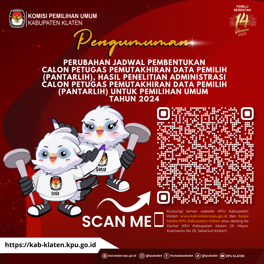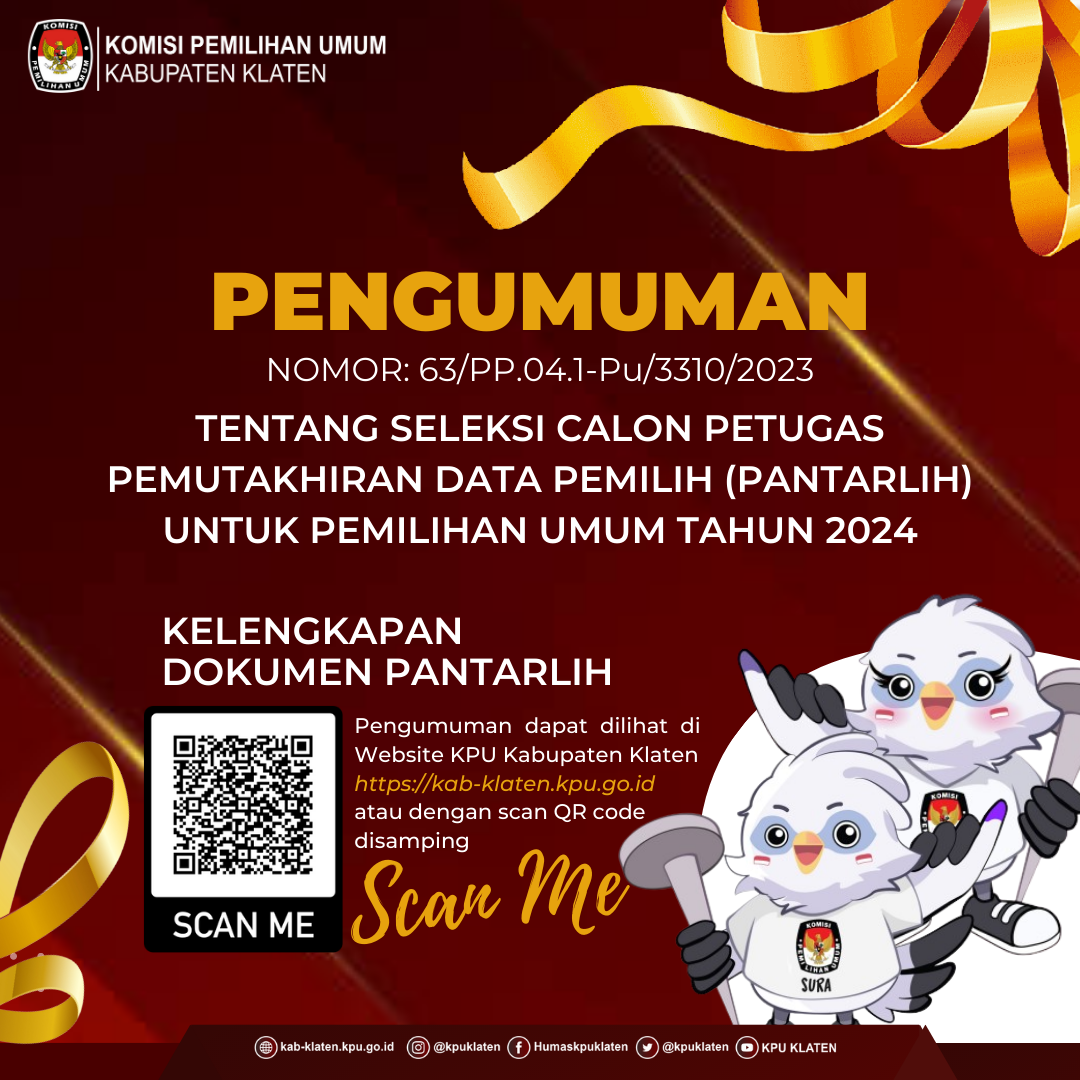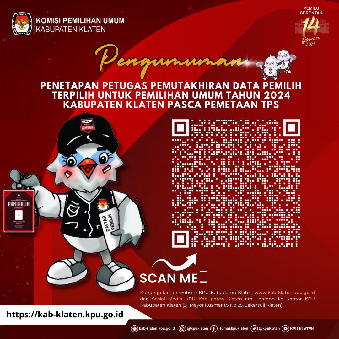 Sehubungan dengan hal tersebut di atas, Panitia Pemungutan Suara Kelurahan/Desa Se-Kabupaten Klaten mengundang Calon Petugas Pemutakhiran Data Pemilih terpilih untuk hadir dalam Pelantikan, Apel Kesiapan, dan Bimbingan Teknis, serta penandatanganan pakta integritas anggota Pantarlih sesuai Pengumuman di Desa/Kelurahan wilayahnya kerja masing-masing.