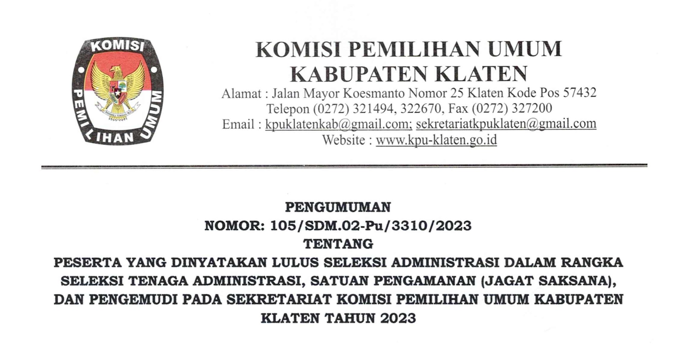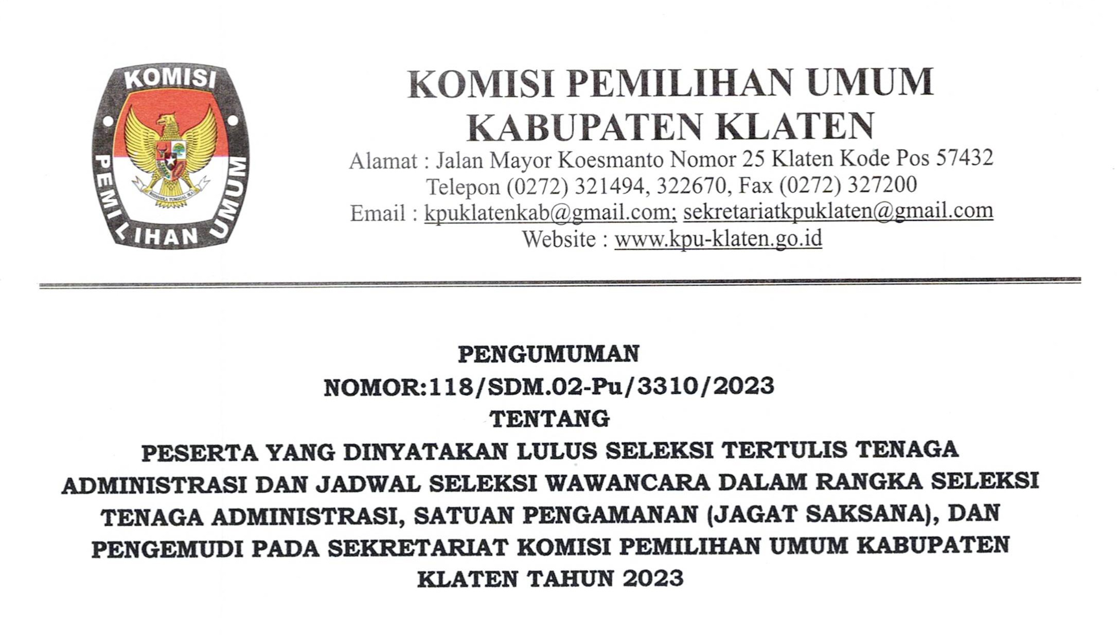 Pada hari Sabtu tanggal sebelas bulan Februari tahun dua ribu dua puluh tiga, Panitia Pemungutan Suara Kelurahan/Desa Se-Kabupaten Klaten telah melaksanakan tahapan Penetapan Hasil Seleksi Petugas Pemutakhiran Data Pemilih untuk Pemilihan Umum Tahun 2024 pasca pemetaan TPS berdasarkan Berita Acara KPU Kabupaten Klaten Nomor 29/PP.04.1-BA/3310/2023 tentang Rapat Pleno Persetujuan Hasil Seleksi Pantarlih Berdasarkan Restrukturisasi dan Pemetaan TPS Pemilu Tahun 2024, sehubungan dengan hal tersebut disampaikan hal-hal sebagai berikut: