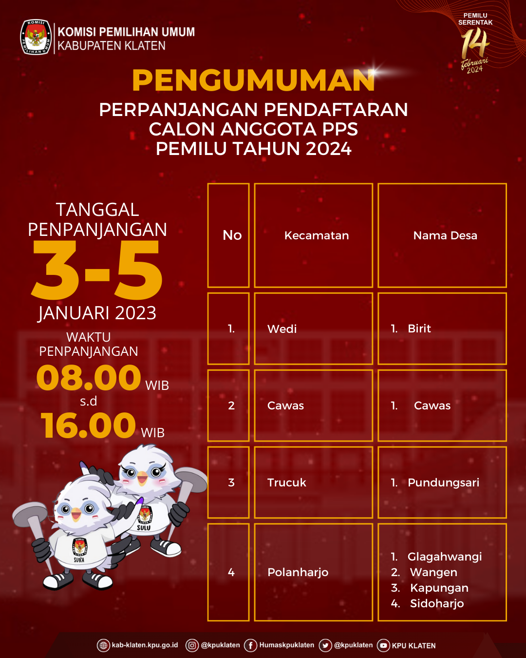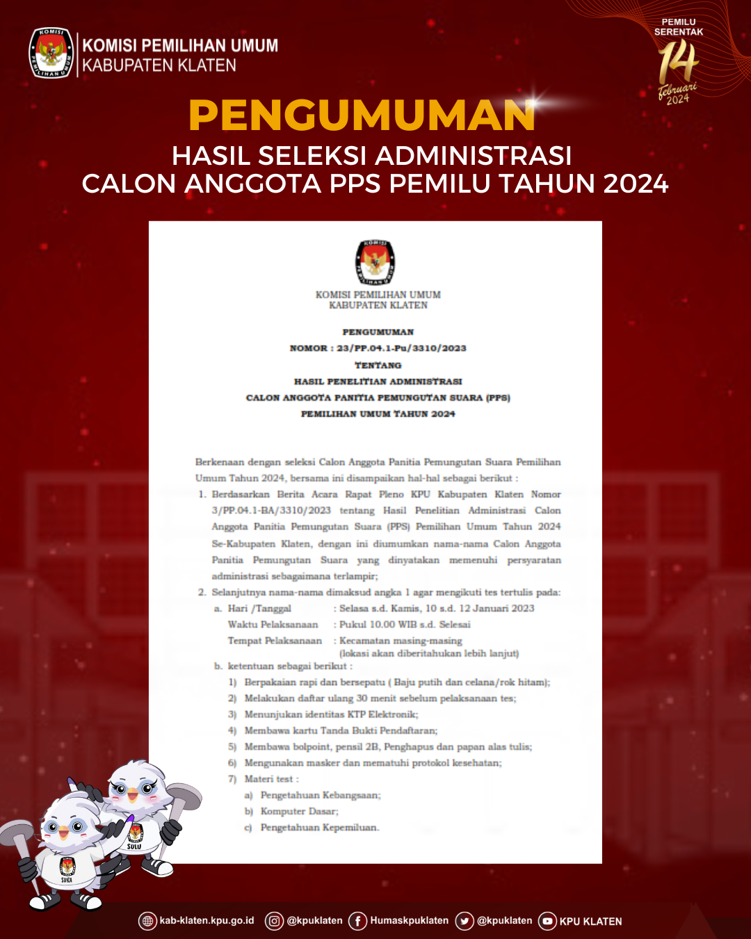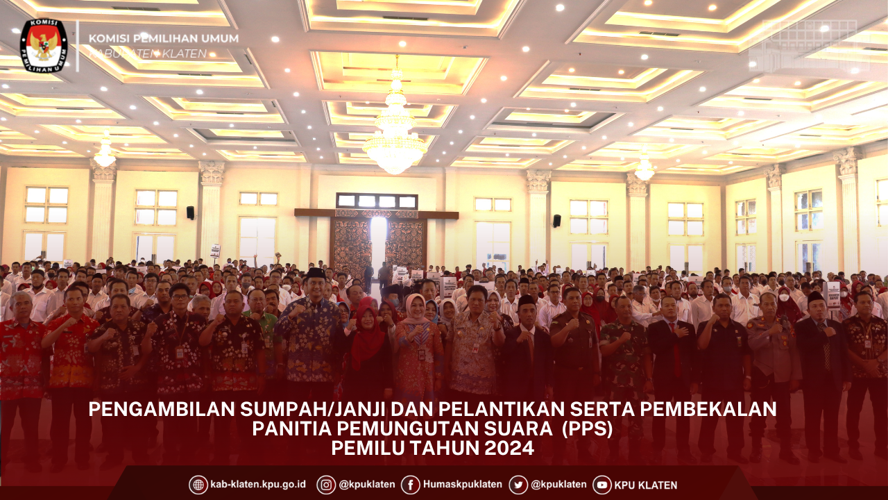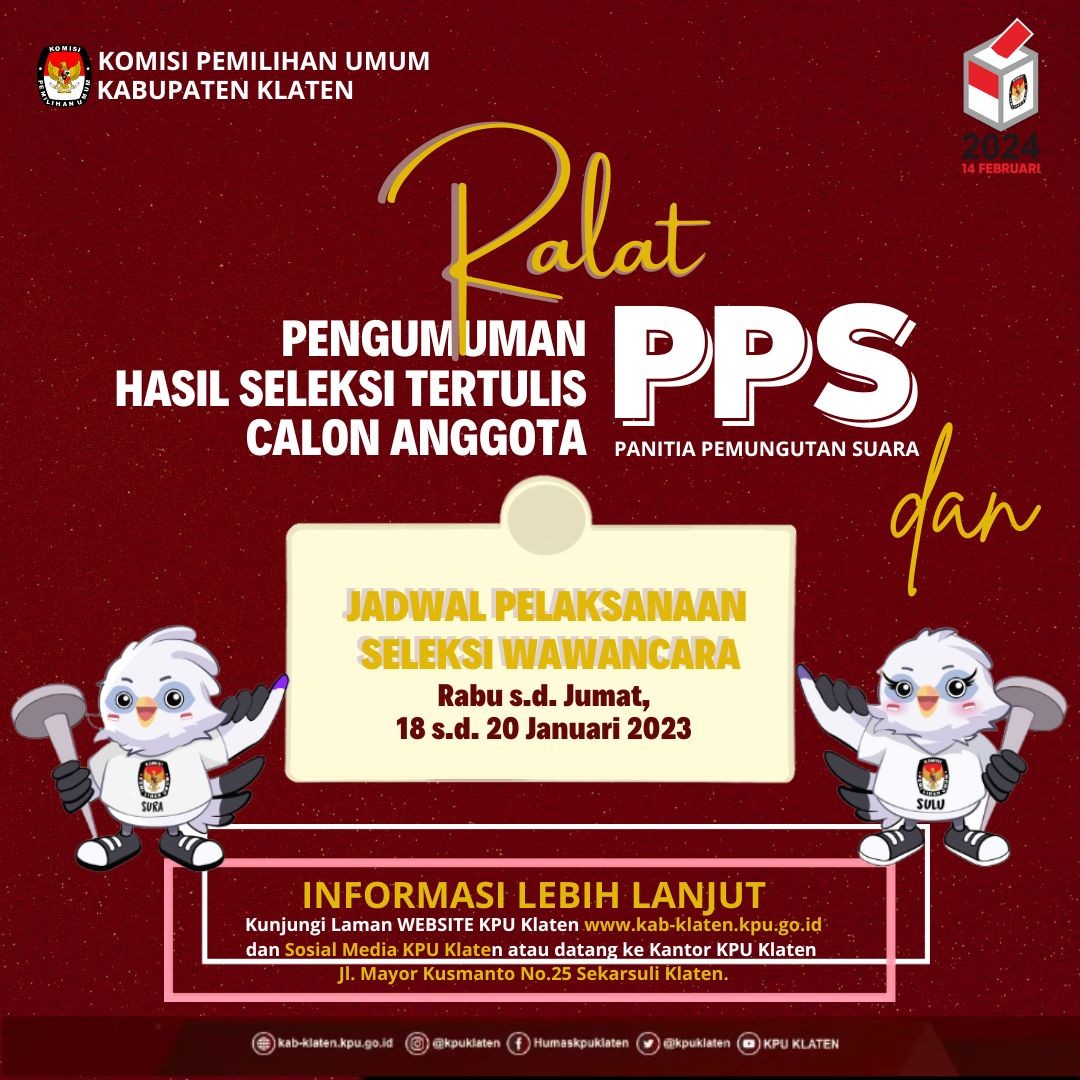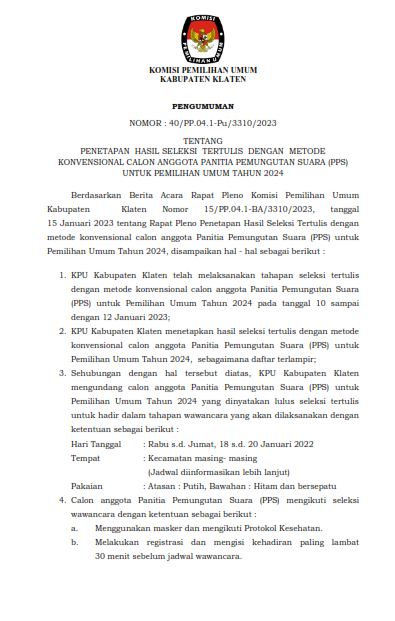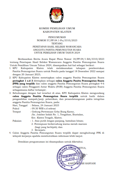 PENGUMUMAN NOMOR 57/PP.04.1-Pu/3310/2023 TENTANG PENETAPAN HASIL SELEKSI WAWANCARA ANGGOTA PANITIA PEMUNGUTAN SUARA UNTUK PEMILIHAN UMUM TAHUN 2024 Berdasarkan Berita Acara Rapat Pleno Nomor 18/PP.04/1-BA/3310/2023 tentang Penetapan Hasil Seleksi Wawancara Anggota Panitia Pemungutan Suara Untuk Pemilihan Umum Tahun 2024, disampaikan hal-hal sebagai berikut: KPU Kabupaten Klaten telah melaksanakan tahapan pembentukan Panitia Pemungutan Suara untuk Pemilu pada tanggal 18 Desember 2022 sampai dengan 20 Januari 2023; KPU Kabupaten Klaten menetapkan calon anggota Panitia Pemungutan Suara peringkat 1 s.d 3 ditetapkan sebagai calon Anggota Panita Pemungutan Suara (PPS) yang terpilih dan calon anggota Panitia Pemungutan Suara peringkat 4-6 sebagai calon Pengganti Antar Waktu (PAW) Anggota Panitia Pemungutan Suara sebagaimana daftar terlampir; Sehubungan dengan hal tersebut di atas, KPU Kabupaten Klaten mengundang calon Anggota Panitia Pemungutan Suara terpilih untuk hadir dalam pengambilan sumpah/janji, pelantikan, dan penandatanganan pakta integritas anggota Panitia Pemungutan Suara, pada: Hari, Tanggal : Selasa, 24 Januari 2023 Pukul : 09.30 WIB s.d selesai Tempat : Gedung Pertemuan Grha Bung Karno, Jln. Jombor Indah No. 1, Tengahan, Buntalan, Kec. Klaten Tengah, Klaten. Pakaian : 1. Atas putih lengan panjang, bawahan hitam; 2. Perempuan berkerudung warna merah maroon (bagi yang berhijab); dan 3. Bersepatu 4.Calon Anggota Panitia Pemungutan Suara terpilih dapat menghubungi PPK di wilayah kerjanya apabila membutuhkan informasi lebih lanjut. Demikian pengumuman ini disampaikan untuk diketahui. Pengumuman Penetapan Hasil Seleksi Wawancara [Klik Disini]