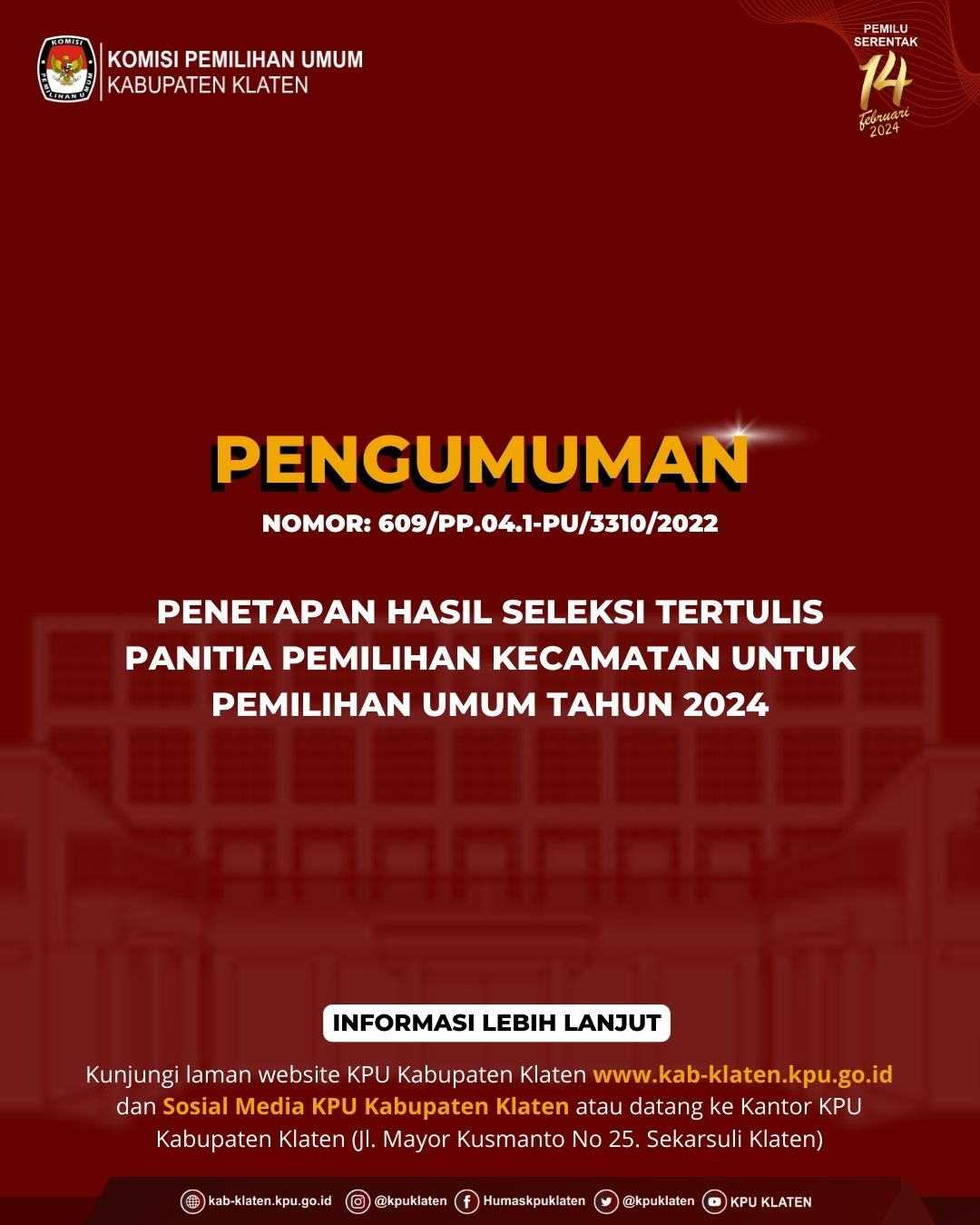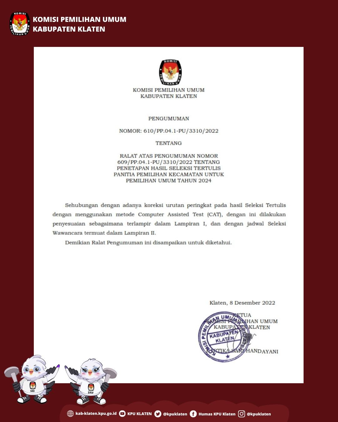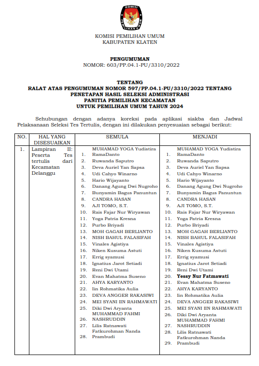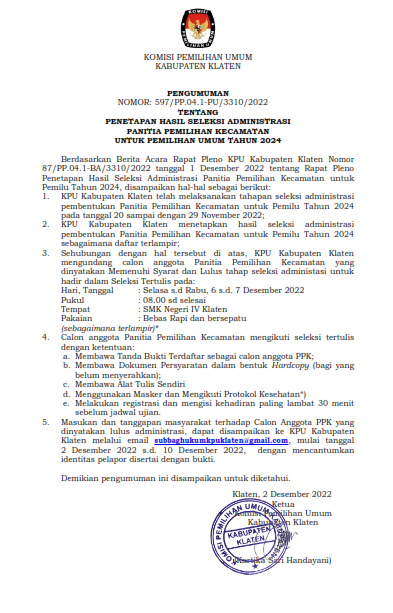 RALAT ATAS PENGUMUMAN NOMOR 609/PP.04.1-PU/3310/2022 TENTANG PENETAPAN HASIL SELEKSI TERTULIS PANITIA PEMILIHAN KECAMATAN UNTUK PEMILIHAN UMUM TAHUN 2024
