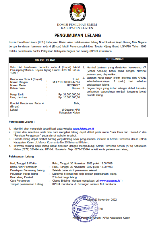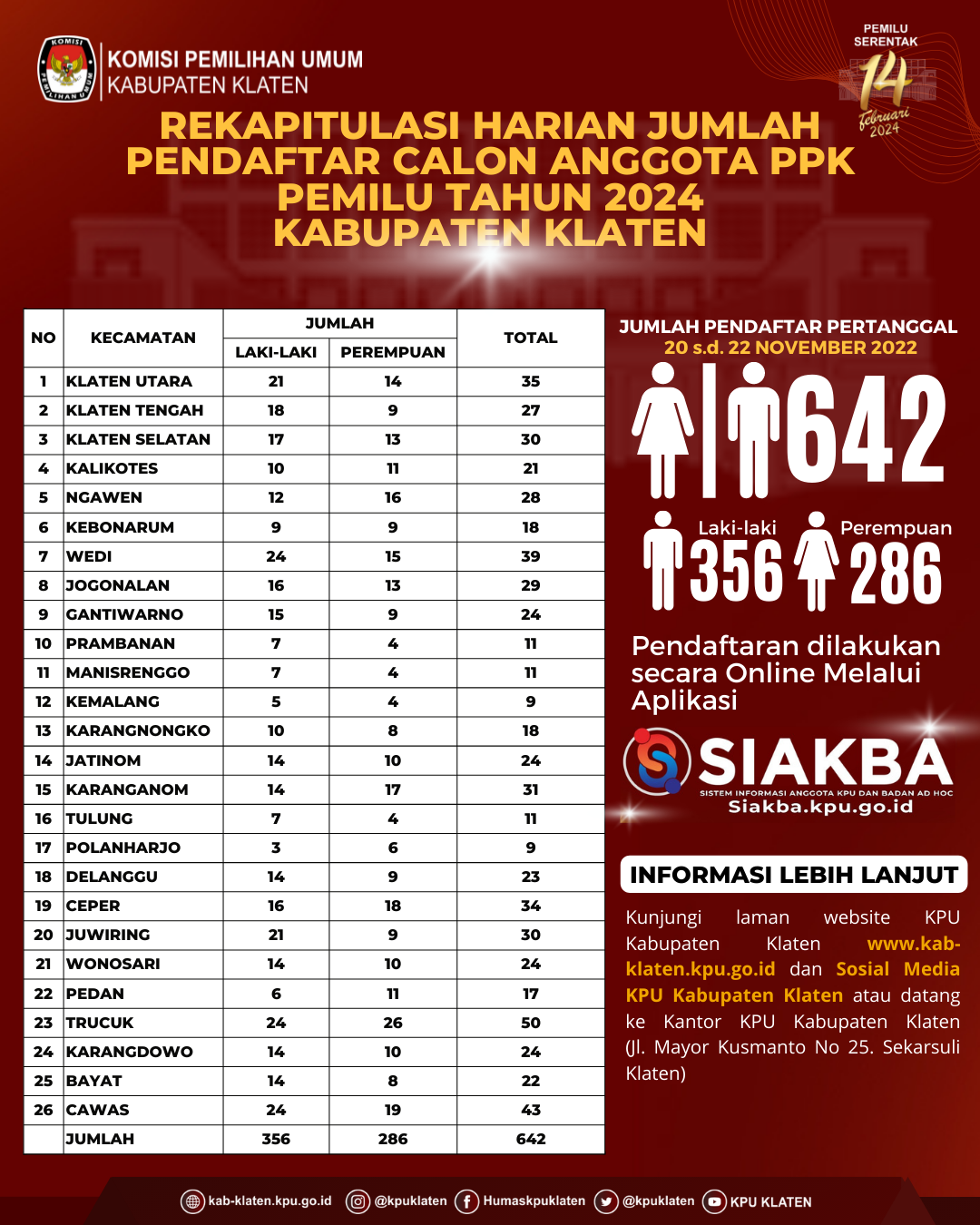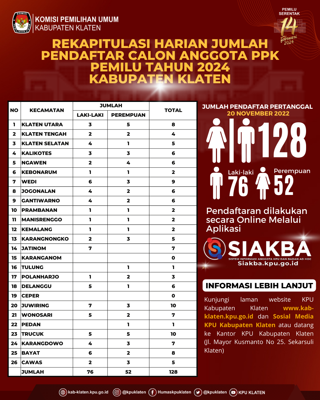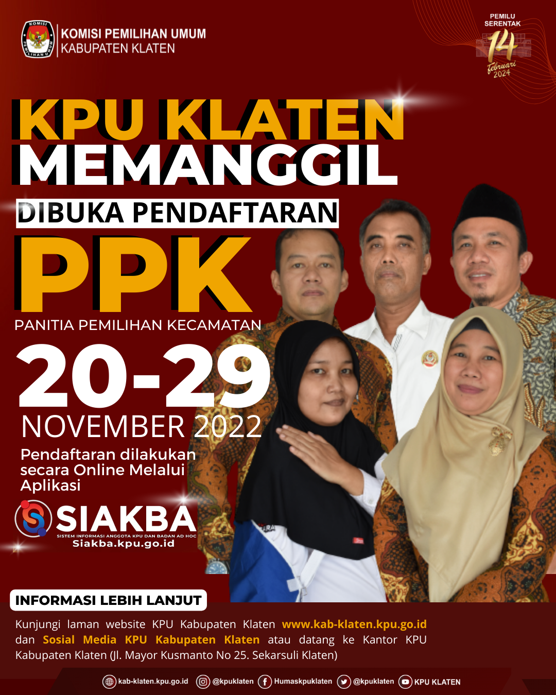 Dalam rangka pembentukan Calon Anggota Panitia Pemilihan Kecamatan, Komisi Pemilihan Umum Kabupaten Klaten mengundang Warga Negara Indonesia yang memenuhi kualifikasi untuk mendaftarkan diri menjadi anggota Panitia Pemilihan Kecamatan (PPK) untuk Pemilihan Umum Tahun 2024 dengan ketentuan sebagai berikut: