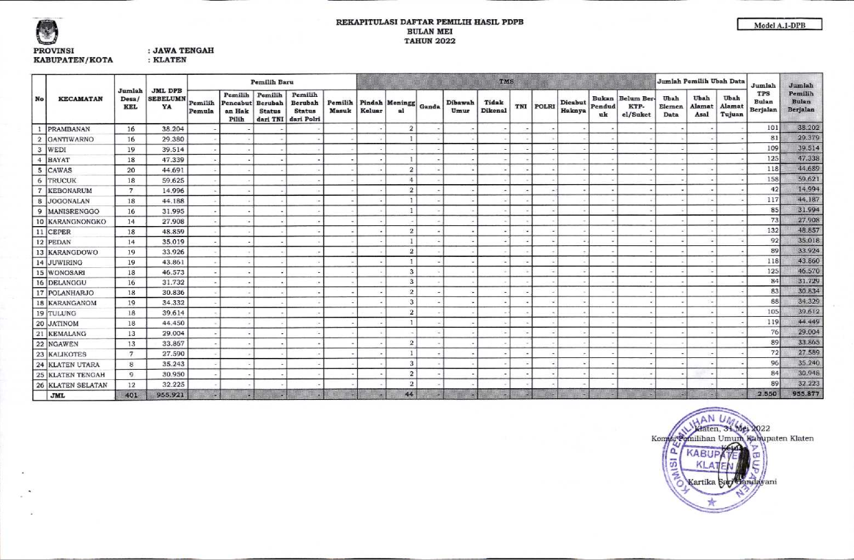 PENGUMUMAN NOMOR 7/PL.01.1-Pu/05/2022 TENTANG PENDAFTARAN PARTAI POLITIK CALON PESERTA PEMILU TAHUN 2024 << KLIK DI SINI Komisi Pemilihan Umum membuka pendaftaran Partai Politik Calon Peserta Pemilihan Umum Tahun 2024 dengan ketentuan sebagai berikut: A. DOKUMEN PENDAFTARAN 1. surat pendaftaran Partai Politik; 2. surat pernyataan dari Pimpinan Partai Politik tingkat pusat yang dibuat menggunakan formulir MODEL F-SURAT.PERNYATAAN-PARPOL yang ditandatangani oleh Pimpinan Partai Politik tingkat pusat dibubuhi cap Partai Politik dan meterai yang cukup, yang menyatakan bahwa: data dan dokumen persyaratan Partai Politik calon peserta Pemilu yang telah diinput dan diunggah melalui Sipol benar dan lengkap sesuai dengan peraturan perundang-undangan; memiliki Berita Negara Republik Indonesia yang menyatakan partai politik tersebut terdaftar sebagai badan hukum; memiliki salinan AD dan ART yang disahkan oleh menteri yang menyelenggarakan urusan pemerintahan di bidang hukum dan hak asasi manusia; memiliki kepengurusan Partai Politik di seluruh provinsi, 75% (tujuh puluh lima persen) dari jumlah kabupaten/kota dalam wilayah kepengurusan tingkat provinsi, dan 50% (lima puluh persen) dari jumlah kecamatan dalam wilayah kepengurusan tingkat kabupaten/kota; menyertakan paling sedikit 30% (tiga puluh persen) keterwakilan perempuan pada kepengurusan Partai Politik tingkat pusat dan memperhatikan 30% (tiga puluh persen) keterwakilan perempuan pada kepengurusan Partai Politik tingkat provinsi dan kabupaten/kota; memiliki anggota sekurang-kurangnya 1.000 (seribu) orang atau 1/1.000 (satu per seribu) orang dari jumlah Penduduk pada kepengurusan Partai Politik tingkat kabupaten/kota dengan kepemilikan KTA dan KTP-el atau KK anggota Partai Politik; mempunyai Kantor Tetap yang digunakan sebagai kesekretariatan dalam menjalankan fungsi Partai Politik pada setiap kepengurusan Partai Politik tingkat pusat, provinsi, dan kabupaten/kota sampai tahapan terakhir Pemilu dibuktikan dengan surat keterangan tentang Kantor Tetap pengurus Partai Politik pada tingkat pusat, provinsi, dan kabupaten/kota menggunakan formulir MODEL F-KANTOR.TETAP-PARPOL yang dilampiri rekapitulasi daftar Kantor Tetap pengurus Partai Politik pada tingkat pusat, provinsi, dan kabupaten/kota; memiliki surat keterangan tentang pendaftaran Partai Politik sebagai badan hukum yang memuat nama, lambang, dan tanda gambar Partai Politik dari menteri yang menyelenggarakan urusan pemerintahan di bidang hukum dan hak asasi manusia disertai dengan lambang dan tanda gambar Partai Politik berwarna; dan menyerahkan bukti kepemilikan nomor rekening atas nama Partai Politik pada tingkat pusat, provinsi, dan kabupaten/kota kepada KPU. 3. rekapitulasi jumlah pengurus dan anggota Partai Politik calon peserta Pemilu menggunakan formulir MODEL F-REKAP.PENDAFTARAN-PARPOL. B. WAKTU DAN TEMPAT PELAKSANAAN PENDAFTARAN 1. Waktu Pendaftaran Hari/Tanggal : Senin, 1 Agustus s.d. Sabtu, 13 Agustus 2022 Waktu : Pukul 08:00 WIB s.d. 16:00 WIB Hari/Tanggal : Minggu, 14 Agustus 2022 Waktu : Pukul 08:00 WIB s.d. 23:59 WIB 2. Tempat Pendaftaran Kantor KPU Jl Imam Bonjol No. 29, Jakarta Pusat C. LAIN-LAIN 1. Ketentuan Pengajuan Pendaftaran Partai Politik calon peserta Pemilu dapat mengajukan pendaftaran setelah mengirimkan data dan dokumen persyaratan yang diunggah melalui Sipol. Pendaftaran dilakukan oleh Pimpinan Partai Politik tingkat pusat yang sah sesuai dengan keputusan Pimpinan Partai Politik tingkat pusat tentang kepengurusan Partai Politik tingkat pusat yang disahkan oleh menteri yang menyelenggarakan urusan pemerintahan di bidang hukum dan hak asasi manusia. Dalam hal Pimpinan Partai Politik tingkat pusat tidak dapat hadir pada saat pendaftaran, dapat diwakilkan oleh Pengurus Partai Politik Tingkat Pusat atau Petugas Penghubung tingkat pusat yang diberi kuasa. Dokumen pendaftaran ditandatangani oleh Pimpinan Partai Politik tingkat pusat yang sah sesuai dengan keputusan Pimpinan Partai Politik tingkat pusat tentang kepengurusan Partai Politik tingkat pusat yang disahkan oleh menteri yang menyelenggarakan urusan pemerintahan di bidang hukum dan hak asasi manusia, dibubuhi cap Partai Politik, dan dicetak dari Sipol. 2. Dalam hal pemeriksaan kelengkapan berkas pendaftaran ditemukan: a. isian data dan unggahan dokumen persyaratan menjadi peserta Pemilu tidak lengkap; b. dokumen pendaftaran tidak lengkap; dan c. dokumen pendaftaran tidak dicetak dari Sipol, KPU mengembalikan dokumen pendaftaran Partai Politik calon peserta Pemilu. 3. Partai Politik calon peserta Pemilu yang dikembalikan dokumen pendaftarannya sebagaimana dimaksud pada angka 2 masih dapat melakukan pendaftaran sampai dengan batas akhir waktu pendaftaran pada Hari terakhir. 4. Dokumen pendaftaran Partai Politik calon Peserta Pemilu sebagaimana dimaksud pada huruf A dapat diunduh pada laman https://sipol.kpu.go.id 5. Pelayanan dan penjelasan informasi terkait pendaftran Partai Politik calon peserta Pemilu dapat menghubungi helpdesk KPU a. Telephone (021) 3916322 dan (021) 3916323 pada hari kerja pada pukul 08.00 s.d 17.00 WIB b. No Hp Sdri. Riyani Indriastuti (08170047707) dan Sdr. Firdaus Pandu Aji (083808797981) c. email : sipol@kpu.go.id