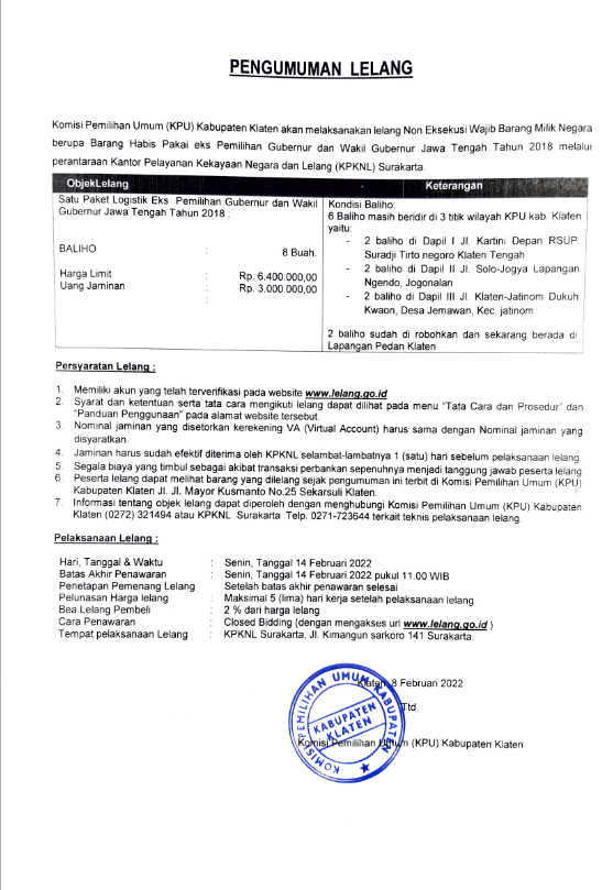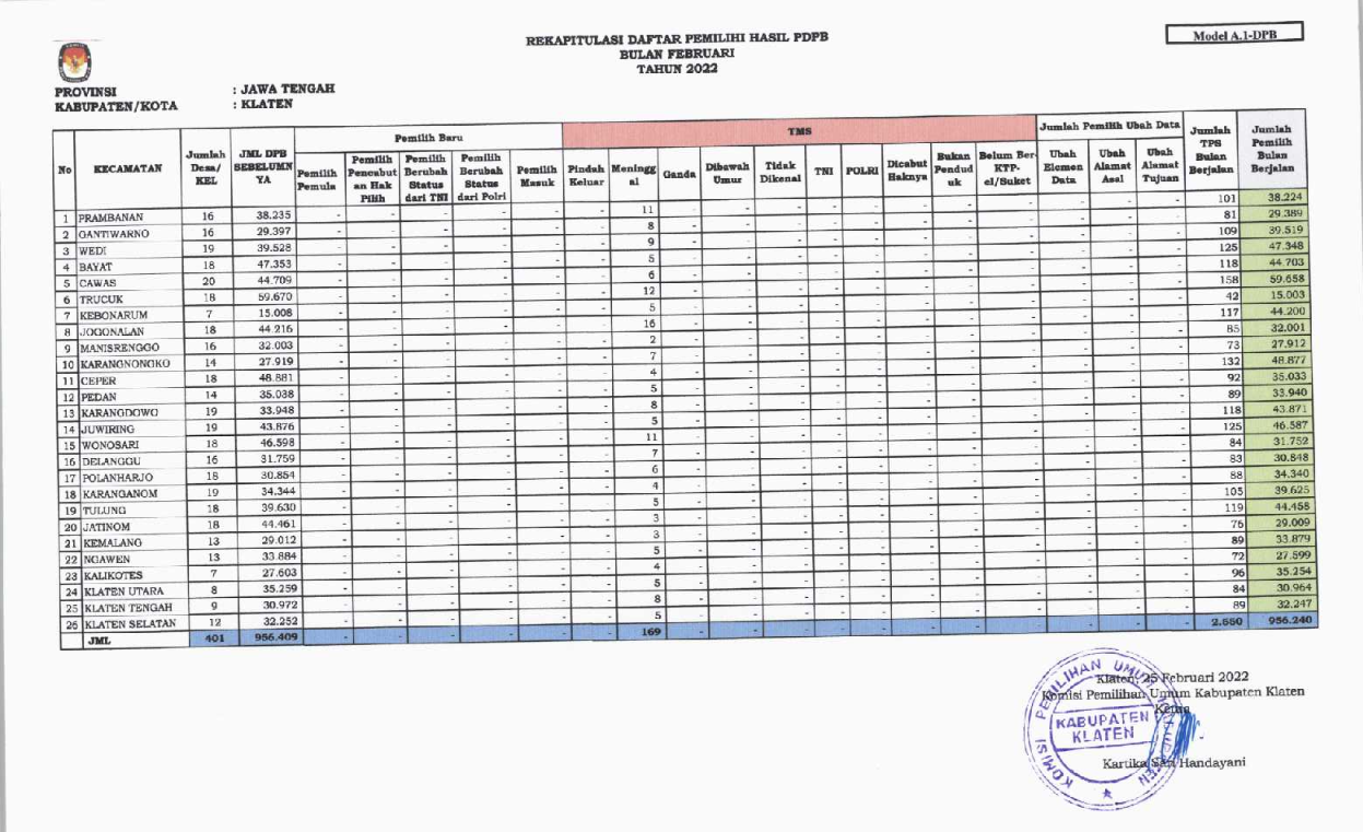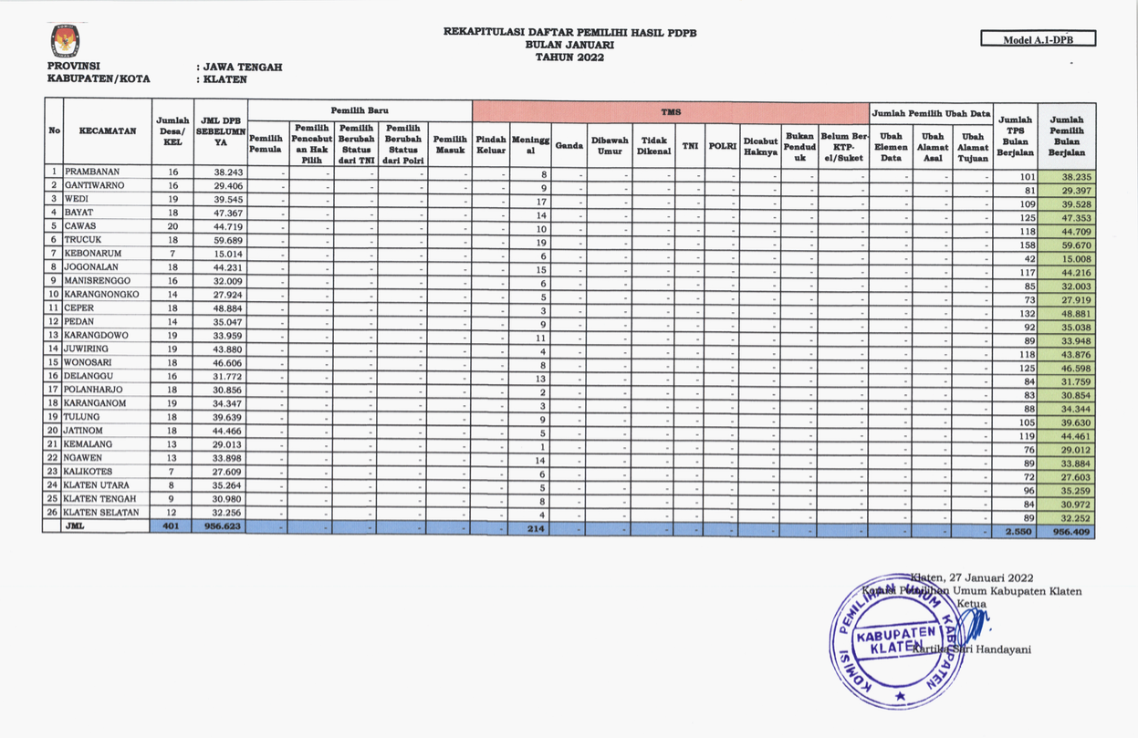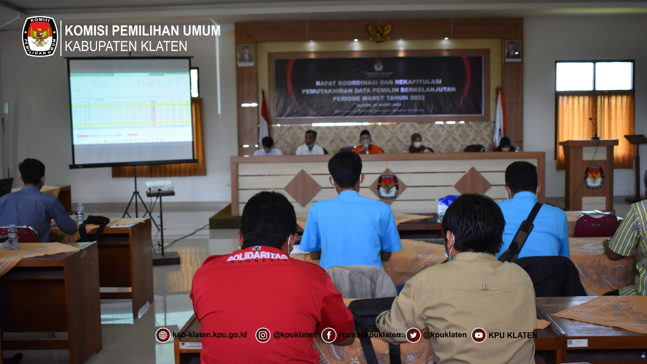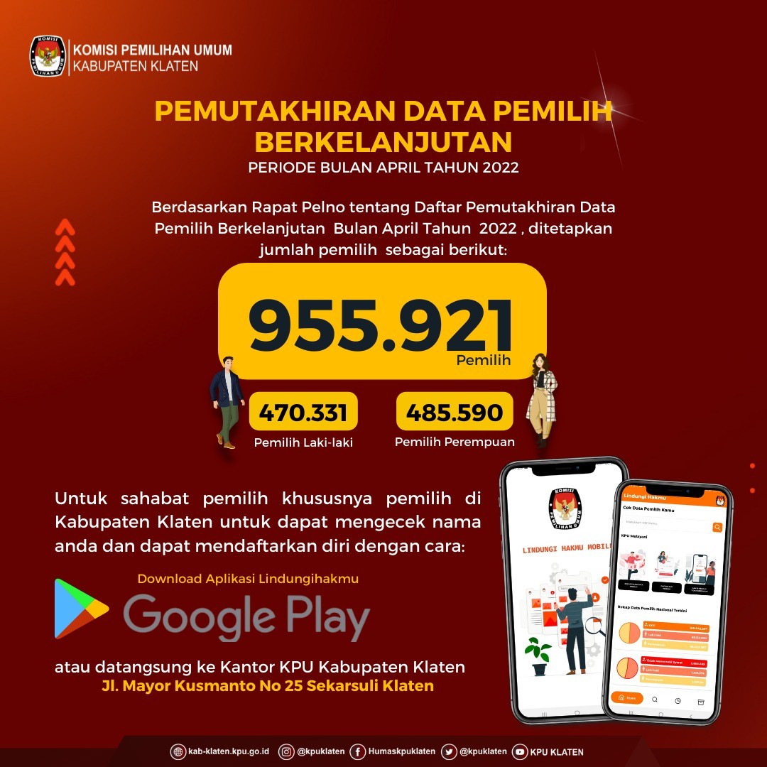 Klaten – Komisi Pemilihan Umum (KPU) Kabupaten Klaten menyelenggarakan kegiatan pemutakhiran Data Pemilih Berkelanjutan Tahun 2021 Periode Bulan Maret Sesuai Amanat Undang-Undang Nomor 7 Tahun 2017 tentang Pemilihan Umum, pada Pasal 20 huruf (l), KPU Kabupaten/Kota berkewajiban melakukan pemutakhiran dan memelihara data pemilih secara berkelanjutan dengan memperhatikan data kependudukan sesuai ketentuan peraturan perundang-undangan; Dan Amanat Peraturan KPU Nomor 2 Tahun 2017, Pasal 27 ayat (3),menyatakan setelah pemungutan suara, KPU/KIP Kabupaten/Kota memasukan data DPTb pada Informasi Data Pemilih guna Pemutakhiran Data Pemilih berkelanjutan untuk Pemilihan atau Pemilu berikutnya; Serta Amanat Peraturan KPU Nomor 11 Tahun 2018, Pasal 58 ayat (1), menyatakan KPU menggunakan hasil kegiatan penyusunan Daftar Pemilih sebagai bahan dalam kegiatan Pemutakhiran Data Pemilih Berkelanjutan, serta Surat Edaran KPU RI nomor : 132/PL.02-SD/01/KPU/II/2021 tanggal 4 Maret 2021 tentang Pemutakhiran Data Pemilih Berkelanjutan Tahun 2021, maka KPU Kabupaten Klaten melaksanakan rapat pleno Pemutakhiran Data Pemilih Berkelanjutan Tahun 2022 periode Bulan Maret Tahun 2022 bertempat dikantor KPU Kab. Klaten Adapun hasil dari Rapat pleno adalah: DOWNLOAD Tujuan dilaksanakannya Pemutakhiran Data Pemilih Berkelanjutan yaitu untuk memperbaharui data pemilih guna mempermudah proses pemutakhiran data dan penyusunan Daftar Pemilih pada Pemilu/Pemilihan berikutnya. KPU Kabupaten Klaten dalam melaksanakan Pemutakhiran Data Pemilih Berkelanjutan ini, membuka layanan Pelaporan dan Tanggapan Masyarakat, baik secara online maupun secara offline. Adapun Pelaporan Masyarakat dalam memberikan tanggapan/masukan terhadap Data Pemilih berupa : 1.Memperbaiki Elemen Data Pemilih 2.Pemilih Baru (berusia 17 tahun sejak tanggal dan sudah melakukan perekaman E-KTP) 3.Pindah Domisili 4.Baru menjadi anggota TNI/POLRI 5.Purna dari TNI/ POLRI 6.Adanya anggota keluarga yang sudah meninggal Dan kondisi lainnya yang bisa dilihat dalam form. Untuk Pelaporan tanggapan dan masukan masyarakat melalui mode Offline, masyarakat dapat langsung mendatangi Kantor KPU Kabupaten Klaten dan mengisi Formulir Masukan & Tanggapan, dengan melampirkan data bukti pendukung berupa foto copy KTP/Kartu Keluarga/Suket. Sedangkan Pelaporan melalui Mode Online, masyarakat Kabupaten dapat langsung memberikan masukan dan tanggapan melalui link: http://bit.ly/KPUKLTformMasukanMasyarakat atau WA 0858-4829-2777