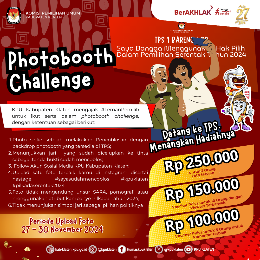 #TemanPemilih KPU Kabupaten Klaten mengajak #TemanPemilih untuk ikut serta dalam photobooth challenge, dengan ketentuan sebagai berikut: