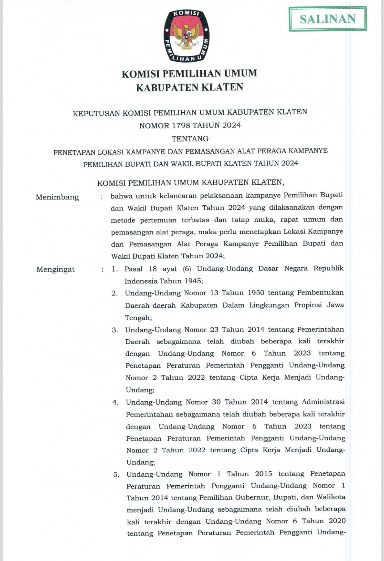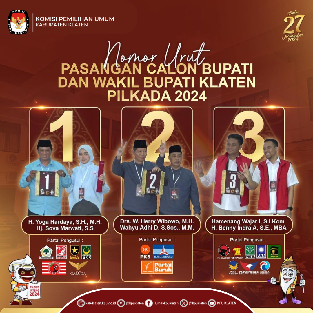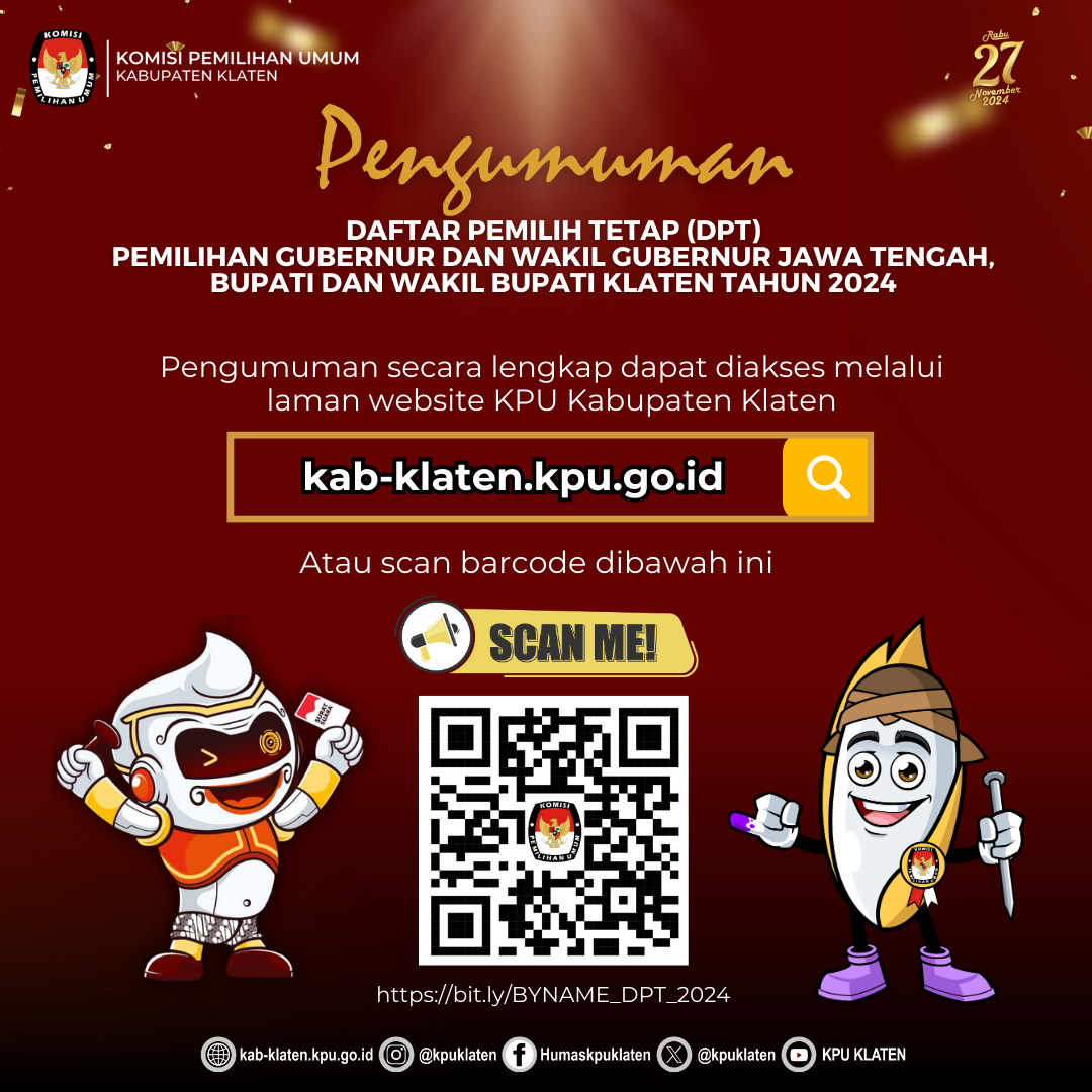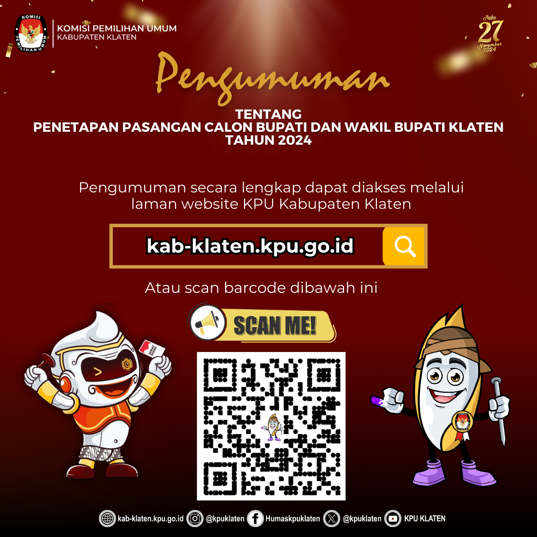 Dalam rangka pembentukan KPPS untuk Pemilihan Gubernur dan Wakil Gubernur, Bupati dan Wakil Bupati, dan Wali Kota dan Wakil Wali Kota Tahun 2024, Komisi Pemilihan Umum Kabupaten Klaten mengundang Warga Negara Indonesia yang memenuhi persyaratan untuk mendaftarkan diri menjadi anggota KPPS untuk Pemilihan Gubernur dan Wakil Gubernur, Bupati dan Wakil Bupati, dan Wali Kota dan Wakil Wali Kota Tahun 2024, Komisi Pemilihan Umum Kabupaten/Kota dengan ketentuan sebagaimana pengumuman ini (Klik Disini)