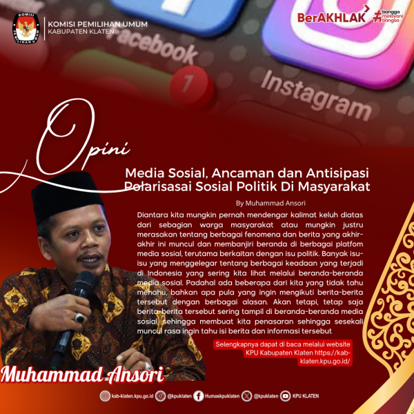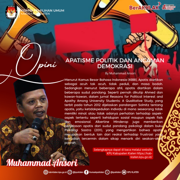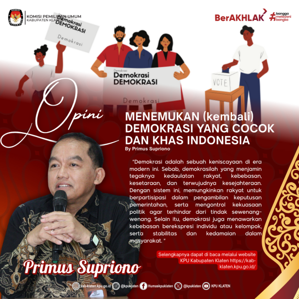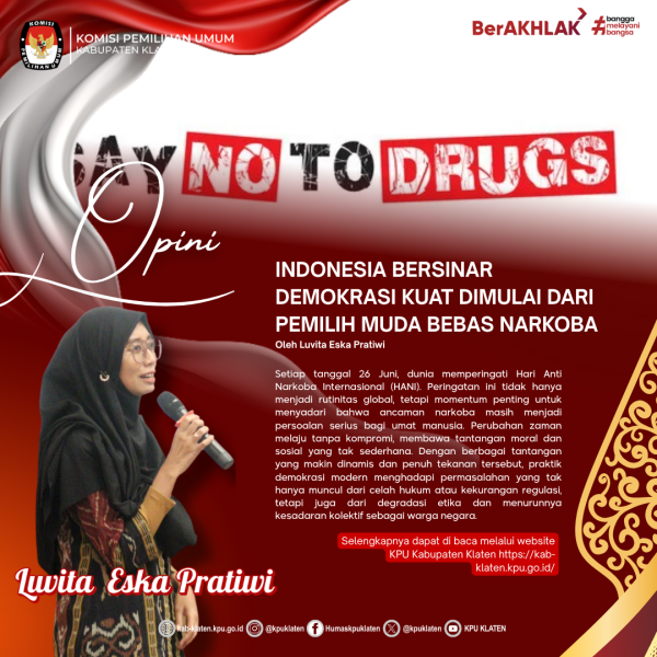 INDONESIA BERSINAR DEMOKRASI KUAT DIMULAI DARI PEMILIH MUDA BEBAS NARKOBA Oleh Luvita Eska Pratiwi Setiap tanggal 26 Juni, dunia memperingati Hari Anti Narkoba Internasional (HANI). Peringatan ini tidak hanya menjadi rutinitas global, tetapi momentum penting untuk menyadari bahwa ancaman narkoba masih menjadi persoalan serius bagi umat manusia. Perubahan zaman melaju tanpa kompromi, membawa tantangan moral dan sosial yang tak sederhana. Dengan berbagai tantangan yang makin dinamis dan penuh tekanan tersebut, praktik demokrasi modern menghadapi permasalahan yang tak hanya muncul dari celah hukum atau kekurangan regulasi, tetapi juga dari degradasi etika dan menurunnya kesadaran kolektif sebagai warga negara. Demokrasi membutuhkan bukan hanya sistem yang kuat, tapi juga nilai yang hidup. Regulasi dan prosedur adalah fondasi, namun keberlanjutannya bergantung pada budaya politik yang sehat dan partisipasi warga yang bermartabat. Ia menuntut fondasi yang sehat, yaitu masyarakat yang bebas dari candu, generasi yang berpikir jernih, dan lingkungan yang berintegritas. Momentum ini menjadi pengingat, bahwa demokrasi yang kuat hanya dapat terwujud jika bangsa ini tumbuh dalam kesadaran kolektif untuk hidup sehat, berpikir rasional, dan menentukan pilihan tanpa tekanan maupun pengaruh destruktif. Ancaman Nyata: Narkoba dan Demokrasi Sebagaimana tercatat dalam data BNN per akhir 2023, bahwa terdapat lebih dari 3,3 juta pengguna narkoba aktif di Indonesia. Angka ini meningkat dari tahun-tahun sebelumnya, dan lebih dari 57% di antaranya berada pada kelompok usia produktif (15–35 tahun). Laporan yang sama juga mencatat bahwa Jawa Tengah menempati posisi ke-5 dalam prevalensi penyalahgunaan narkoba nasional, dengan peningkatan signifikan pada pengguna pemula di kalangan pelajar dan mahasiswa. Sementara itu, catatan penting yang perlu menjadi perhatian adalah hasil penelitian dari Pusat Penelitian Kesehatan Universitas Indonesia (2022), yang menyebutkan bahwa penyalahgunaan narkoba berdampak langsung terhadap penggunanya. Di antaranya adalah dalam hal pengambilan keputusan, perilaku, etika, dan keterlibatan sosial-politik seperti partisipasi dalam pemilu. Tidak hanya berdampak terhadap kesehatan individu, penyalahgunaan narkoba juga berpengaruh terhadap partisipasi politiknya. Individu yang terjerat dalam lingkaran ini cenderung menunjukkan sikap apatis, rentan terhadap manipulasi politik, dan kehilangan kapasitas untuk berpartisipasi secara kritis dalam demokrasi. Hal ini harus menjadi perhatian serius bagi seluruh pemangku kepentingan. Sebagai penyelenggara pemilu sekaligus agen perubahan sosial, KPU dituntut untuk menjadi contoh yang proaktif dalam menciptakan ekosistem demokratis yang bersih, sehat, dan beradab. Sebab demokrasi yang kuat selalu tumbuh dari masyarakat yang sadar, jujur, dan menjaga integritas tidak hanya di bilik suara, tetapi juga dalam kehidupan sehari-hari. Pemilih Generasi Muda: Garda Depan Demokrasi dan Anti Narkoba Bila kita menilik data KPU Jawa Tengah, terdapat lebih dari 52% pemilih Pemilu 2024 di Jawa Tengah berada pada rentang usia 17–39 tahun. Sementara itu di Kabupaten Klaten, dengan total DPT Pilkada 2024 mencapai 973.342 pemilih, ternyata didominasi oleh dua generasi, yaitu Generasi Milenial dan Generasi X. Berdasarkan data olahan KPU Klaten generasi milenial yang lahir antara tahun 1981 hingga 1996, menempati posisi teratas sebesar 29,7% dari total pemilih. Ini menunjukkan bahwa hampir 3 dari 10 pemilih berasal dari kelompok usia 28 hingga 43 tahun. Tak jauh di belakang, generasi X (usia 44–59 tahun) menyumbang 29,1%, pemilih dari kelompok yang stabil dan matang secara politik. Sementara itu, generasi Z, yang merupakan pemilih muda usia 17-27 tahun, tercatat sejumlah 203.938 orang, atau sekitar 21% dari seluruh pemilih. Ini menjadi sinyal penting, bahwa suara anak muda bukan lagi pelengkap, tetapi bisa menjadi penentu. Sebaliknya, generasi yang lebih tua seperti Baby Boomer (60–79 tahun) dan Pre-Boomer (di atas 79 tahun) masing-masing mencatatkan 18,2% dan 2%. Meski secara jumlah lebih kecil, kontribusi mereka tetap penting, terutama dalam stabilitas dan kesinambungan demokrasi. Gambar: Klasifikasi Pemilih DPT Berdasarkan Usia Sumber: KPU Kabupaten Klaten Bisa disimpulkan bahwa Generasi Milenial dan Generasi X memiliki pengaruh yang kuat dalam penyelenggaraan pemilu/pilkada di Klaten. Catatan dari BNN sebagaimana disebutkan di atas menjadi rambu-rambu bahwa kelompok usia produktif ini sekaligus menjadi yang paling rentan terhadap penyalahgunaan narkoba. Oleh karena itu, strategi jangka panjang pencegahan narkoba tidak bisa dilepaskan dari pendidikan politik. Pemilih muda yang sadar, cerdas, dan sehat akan menjadi pondasi demokrasi yang lebih kuat. Pemberdayaan pemilih muda dan penguatan nilai hidup bersih tanpa narkoba sepertinya menjadi dua hal yang perlu disinergikan dalam setiap kegiatan pendidikan pemilih dan forum-forum sosial lainnya. Demokrasi Sehat, Indonesia Bersinar Perlu disadari bersama bahwa bahaya narkoba bukan sekadar isu kesehatan atau kriminalitas, tetapi juga ancaman nyata bagi kualitas demokrasi, generasi penerus, dan masa depan bangsa. Dengan kesadaran kolektif, langkah nyata, dan komitmen bersama, tentu akan tercipta lingkungan yang sehat, aman, dan berdaya, tempat generasi muda bisa tumbuh, memilih dengan cerdas, dan membangun masa depan yang bebas dari narkoba. Pada Peringatan Hari Anti Narkoba ini, mari wujudkan demokrasi yang sehat, partisipatif, dan berintegritas. Karena tanpa lingkungan yang bersih dari narkoba, masa depan demokrasi akan rapuh. Saatnya masyarakat bergerak, Indonesia bersinar. Demokrasi bukan hanya soal memilih, tetapi soal kualitas manusia yang memilih dan dipilih. Narkoba merusak pilar itu dari dalam. Maka, pemberantasan narkoba adalah bagian integral dari menjaga demokrasi tetap hidup, sehat, dan berintegritas. *** *** (Luvita Eska Pratiwi – Staf Subbagian SDM dan Partisipasi Masyarakat KPU Kabupaten Klaten) Refe
