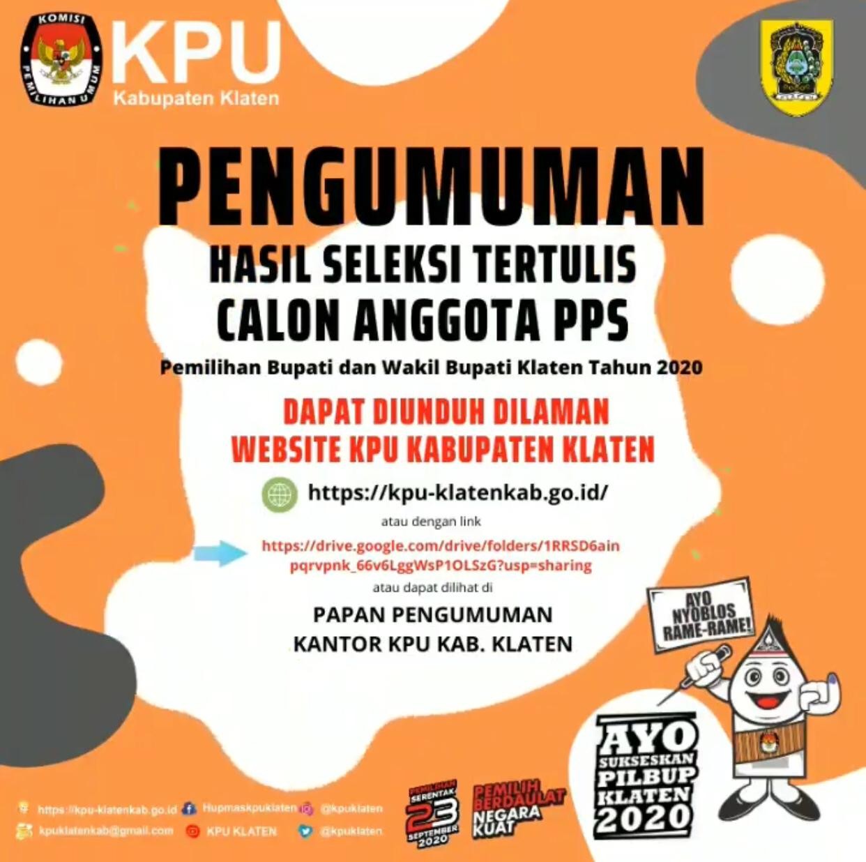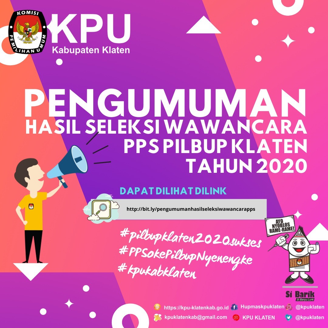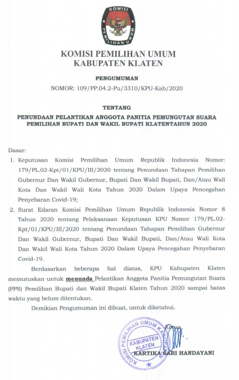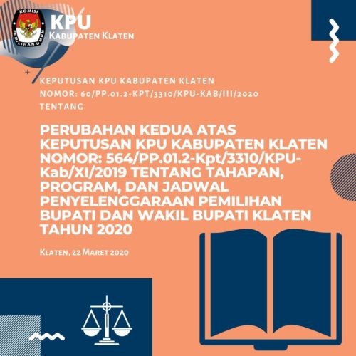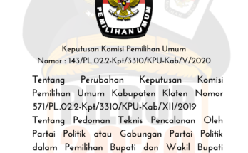 Keputusan Komisi Pemilihan Umum Nomor : 143/PL.02.2-Kpt/3310/KPU-Kab/V/2020 Tentang Perubahan Keputusan Komisi Pemilihan Umum Kabupaten Klaten Nomor 571/PL.02.2-Kpt/3310/KPU-Kab/XII/2019 Tentang Pedoman Teknis Pencalonan Oleh Partai Politik atau Gabungan Partai Politik dalam Pemilihan Bupati dan Wakil Bupati Klaten Tahun 2020.