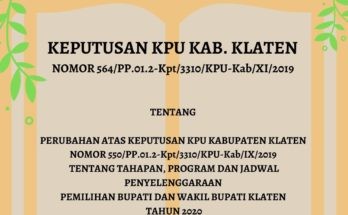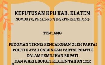 KEPUTUSAN KPU KABUPATEN KLATEN NOMOR 571/PL.02.2-Kpt/3310/KPU-Kab/XII/2019 TENTANG PEDOMAN TEKNIS PENCALONAN OLEH PARTAI POLITIK ATAU GABUNGAN PARTAI POLITIK DALAM PEMILIHAN BUPATI DAN WAKIL BUPATI KLATEN TAHUN 2020, dapat diunduh [DISINI]