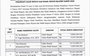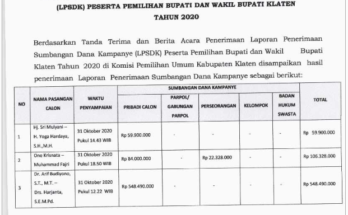 Berdasarkan hasil penerimaan Laporan Penerimaan Sumbangan Dana Kampanye, disampaikan Laporan Penerimaan Sumbangan Dana Kampanye untuk masing-masing Peserta Pemilihan Bupati dan Wakil Bupati Klaten Tahun 2020.