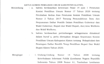 TENTANG HASIL PENERIMAAN LAPORAN PENERIMAAN SUMBANGAN DANA KAMPANYE (LPSDK) PESERTA PEMILIHAN BUPATI DAN WAKIL BUPATI KLATEN TAHUN 2020