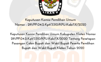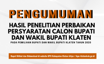 Berdasarkan Ketentuan Pasal 54 Peraturan Komisi Pemilihan Umum Nomor 3 Tahun 2017 tentang Pencalonan Pemilihan Gubernur dan Wakil Gubernur, Bupati dan Wakil Bupati, dan/atau Walikota dan Wakil Walikota, sebagaimana diubah terakhir dengan Peraturan Komisi Pemilihan Umum Nomor 9 Tahun 2020, dengan ini Komisi Pemilihan Umum Kabupaten Klaten mengumumkan hasil verifikasi syarat Pasangan Calon Bupati dan Wakil Bupati Klaten Tahun 2020 sebagai berikut :