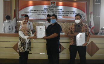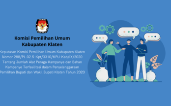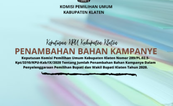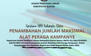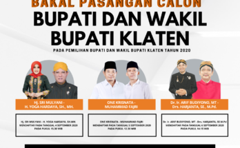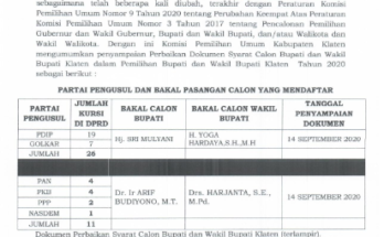 Berdasarkan Ketentuan Pasal 54 Peraturan Komisi Pemilihan Umum Nomor 3 Tahun 2017 tentang Pencalonan Pemilihan Gubernur dan Wakil Gubernur, Bupati dan Wakil Bupati, dan/atau Walikota dan Wakil Walikota, sebagaimana diubah terakhir dengan Peraturan Komisi Pemilihan Umum Nomor 9 Tahun 2020, dengan ini Komisi Pemilihan Umum Kabupaten Klaten mengumumkan hasil verifikasi syarat Pasangan Calon Bupati dan Wakil Bupati Klaten Tahun 2020 sebagai berikut : Hj, Sri Mulyani – H. Yoga Hardaya, S.H.,M.H. dinyatakan Belum Memenuhi Syarat dan Wajib Memperbaharui Dokumen Persayaratan Calon Dr. Ir. Arif Budiyono, MT – Drs. Harjanta, S.E., M.Pd. dinyatakan Belum Memenuhi Syarat dan Wajib Memperbaharui Dokumen Persayaratan Calon Sedangkan bagi Bakal Pasangan Calon Bupati dan Wakil Bupati Klaten atas nama One Krisnata – Muhammad Fajri sedang menjalankan Tahapan Lanjutan Pemeriksaan Kesehatan dan Keabsahan dokumen sesuai dengan Keputusan KPU Kabupaten Klaten Nomor : 284/PP.01.2-Kpt/3310/KPU-Kab/IX/2020. pengumuman dapat dilihat dan dibaca [DISINI]