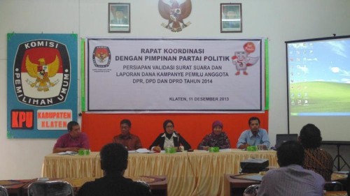 KLATEN – KPU Klaten menyelenggarakan Rakor dengan Pimpinan Partai Politik untuk membahas Persiapan Validasi Surat Suara dan Laporan Dana Kampanye. Rapat yang digelar Rabu (11/12) di Aula KPU Klaten itu dihadiri 12 parpol peserta Pemilu Legislatif 2014. Anggota KPU Klaten, M. Anshori, mengatakan laporan dana kampanye diserahkan ke KPU paling lambat pada 27 Desember 2012 tersebut berupa laporan perolehan sumber dana untuk kampanye. Sedangkan laporan yang berupa penggunaan dana kampanye maksimal dikumpulkan 2 Maret 2014. Meski paling lambat tanggal 27 Desember, namun partai diberikan kesempatan untuk melakukan perbaikan itu dilakukan hingga 30 Desember dan KPU membuka konsultasi bagi para parpol tersebut. Sebelumnya, KPU juga telah mengadakan sosialisasi dan pelatihan tentang penyusunan laporan dana kampanye kepada parpol. Dengan pelatihan dan bimbingan teknis itu, diharapkan parpol yang bertugas menyusun dana kampanye tidak menemukan kendalam dalam penyusunannya.
