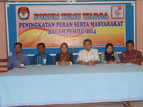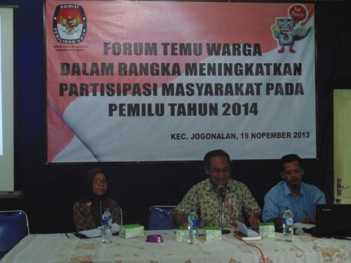 KLATEN – Setelah sehari sebelumnya sukses menggelar Forum Temu Warga di Aula Kecamatan Jogonalan, KPU Klaten kembali menyelenggarakan Forum Temu Warga Peningkatan Peran Serta Masyarakat Dalam Pemilu 2014 yang digelar di Aula Kecamatan Jogonalan Klaten pada Rabu (20/11) jam 13.00 WIB hingga 15.00 WIB. Sama seperti pada acara sebelumnya acara ini diikuti oleh 3 orang (terdiri dari 1 perempuan dan 2 laki-laki) perwakilan tokoh masyarakat dari masing-masing kecamatan. Dalam forum ini muncul beberapa pertanyaan menarik yang diajukan oleh para peserta diantaranya sebagai berikut: Ibu Ningsih Jatinom : Apa upaya kita untuk meningkatkan kwalitas dan kwantitas pemilu…. apakah diijinkan jika saya selaku KPPS mengantarkan surat suara ke pemilih agar mereka mau memilih? Jawaban : Mengkampanyekan cara memilih cerdas dgn mengetahui dan mengenal calaon serta visi misinya dan itu dimualai dari kita, keluarga kita serta komunitas-komunitas di sekitar kita, dan itu membutuhkan kekuatan dan ketauladanan dari kita dan bapak/ibu selaku penyelenggara pemilu, dan orang yang ditokohkan di lingkungan kita. Untuk KPPS mengantarkan surat asal sesuai dengan peraturan dan kondisi tertentu (karena pemilih sakita keras) di perbolehkan. Ibu Yekti Ceper : Golput adalah fenomena yang selalu ada dan makin menggejala karena kwalitas dari hasil pemilu, orang-orang yang terpilih sebagai wakil rakyat dan pemimpin juga banyak yang tidak bisa memberikan contoh kepada rakyat, Bagaiman langkah kita untuk menekan angka golput? Jawaban : kita jangan mengulangi juga dengan cara-cara yang sama (terima money politik, misalnya) dan harus kita mulai dan contohi. Berikut ini respon warga dalam acara tersebut: Aris dari Cawas: “Tolong katakan pada saya, apa yg harus saya lakukan utk membantu KPU meningkatkan partisipasi pemilih.” Yekti dari Ceper: “Andai saja diijinkan atau aturan membolehkan, saya akan mendatangi rumah-rumah sambil membawa surat suara.” Suminten dari Jatinom: “Bagaimana caranya agar pemilih itu benar-benar memilih karena tahu kualitas yang dipilih. Bukan karena uang?” Nardi dari Jogonalan: “Bagaimana cara mengatasi krisis dan apatisme warga terhadap pemilu?” Prapto dari Trucuk: “Saya mendoakan secara khusus, semoga pemilu bisa berjalan dengan lancar dan sukses. Saya juga berdoa khusus untuk KPU Kabupaten Klaten semoga diberi kekuatan menyelenggarakan pemilu yang jurdil.”