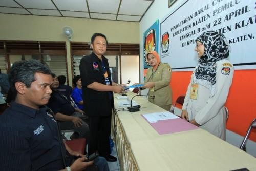 KLATEN – Memasuki hari terakhir pendaftaran, Senin (22/4) jam 09.58 WIB, Partai Nasionalis Demokrat (Nasdem) mendaftarkan 46 calon anggota legislatif (caleg) DPRD Kabupaten Klaten. Dipimpin Ketua DPD Partai Nasdem, Joko Susilo ST, para fungsionaris dan para caleg mendatangi KPU dengan arak-arakan kendaraan bermotor.