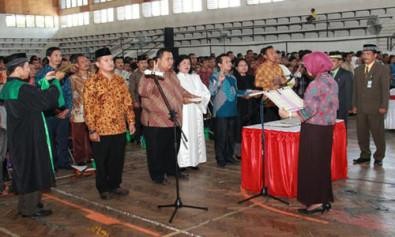 Klaten – Komisi Pemilihan Umum (KPU) Kabupaten Klaten melantik 1323 anggota Panitia Pemilihan Kecamatan (PPK) dan Panitia Pemungutan Suara (PPS) untuk pelaksanaan Pemilihan Bupati dan Wakil Bupati (Pilbup) Klaten 2015. Jumlah itu terdiri dari terdiri dari 130 anggota PPK yang berasal dari 26 kecamatan di Klaten dan 1.203 anggota PPS berasal dari 301 desa dan 10 kelurahan di Kabupaten Klaten. Pelantikan digelar di GOR Gelarsena, Klaten, Rabu (20/5).