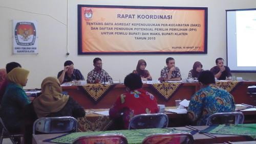 Komisi Pemilihan Umum (KPU) Kabupaten Klaten melakukan sosialisasi terkait penyelenggaraan pemilihan Bupati 2015 kepada Pemerintah, Dinas/Instansi terkait, Partai Politik, Panwaskab, Tokoh Masyarakat, Tokoh Agama, Tokoh Pendidikan, Ormas dan LSM, serta Stakeholder terkait. Sosialisasi ini dilaksanakan pada tanggal 27 Januari 2015 di Aula KPU Kabupaten Klaten.