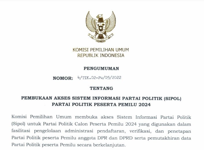 Dengan dibukanya akses Sipol pada 24 Juni 2022, maka setidaknya partai politik memiliki waktu satu bulan lebih untuk menyelesaikan proses penginputan data. Mengingat pengumuman pendaftaran dilaksanakan 29 Juli 2022 dan dimulainya pendaftaran 1 Agustus-14 Agustus 2022. “Amanat UU 7 Tahun 2017 yang memerintahkan KPU memulai pendaftaran partai politik calon peserta pemilu 18 bulan sebelum hari pemungutan suara dan menetapkan partai politik peserta pemilu 14 bulan sebelum hari pemungutan suara,” tambah Idham.