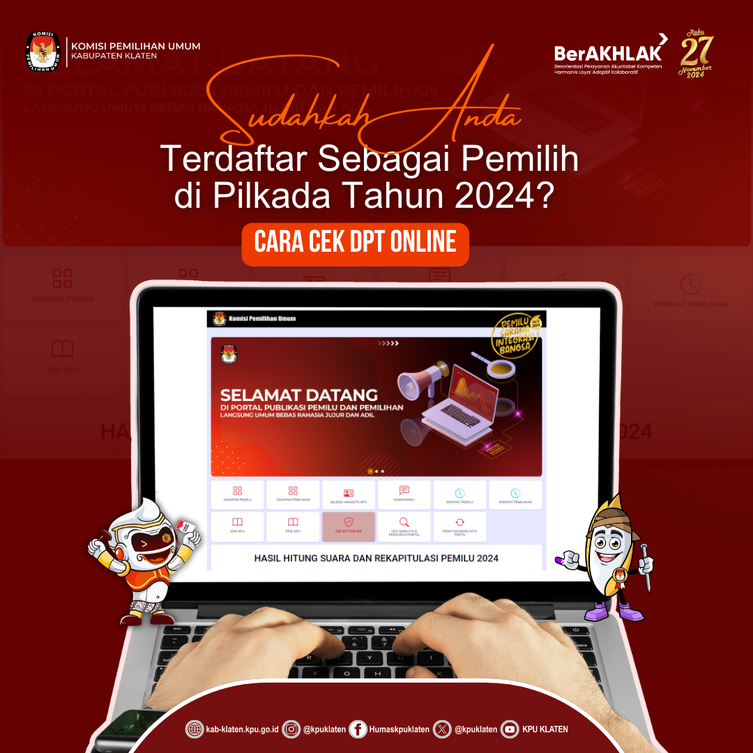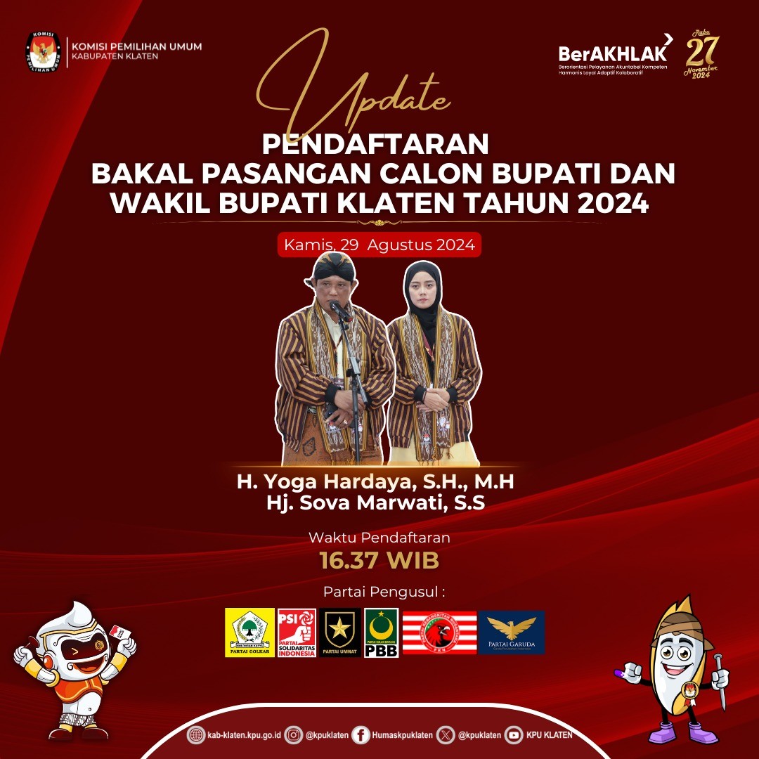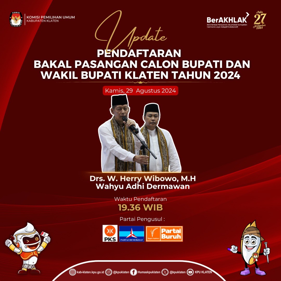 KLATEN - #TemanPemilih Hari ini, Kamis (29/8) merupakan hari terakhir penerimaan pendaftaran Bakal Pasangan Calon Bupati dan Wakil Bupati Klaten. Pada pukul 14.47 WIB, bakal pasangan calon Hamenang Wajar Ismoyo, S.I.Kom. - H. Benny Indra Ardhianto, mendaftarkan diri ke Kantor KPU Klaten. Pasangan tersebut diusung oleh 8 gabungan partai politik, yaitu Partai PDIP, Partai Gerindra, Partai PKB, Partai PAN, Partai PPP, Partai NasDem, Partai Perindo, dan Partai Gelora.