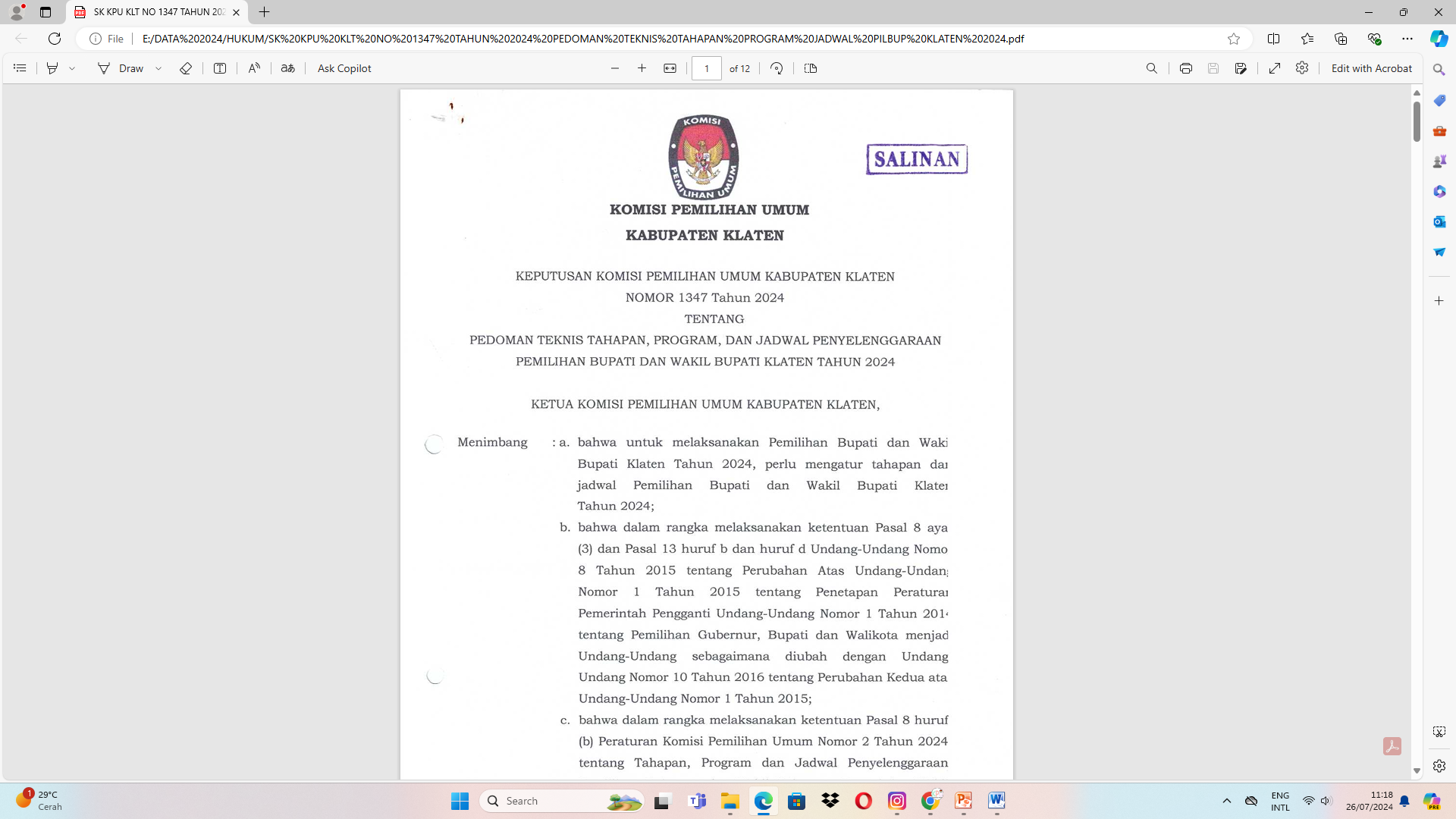 KPU KABUPATEN KLATEN TETAPKAN PEDOMAN TEKNIS TAHAPAN, PROGRAM DAN PENYELENGGARAAN PILBUP KLATEN 2024 Senin, 26 Februari 2024 17:00 62 Komisi Pemilihan Umum Kabupaten Klaten menetapkan Pedoman Teknis Tahapan, Program dan Penyelenggaraan Pemilihan Bupati dan Wakil Bupati Klaten Tahun 2024 Nomor 1347 Tahun 2024 pada tanggal 26 Februari 2024 [KLIK DISINI] Baca Selengkapnya