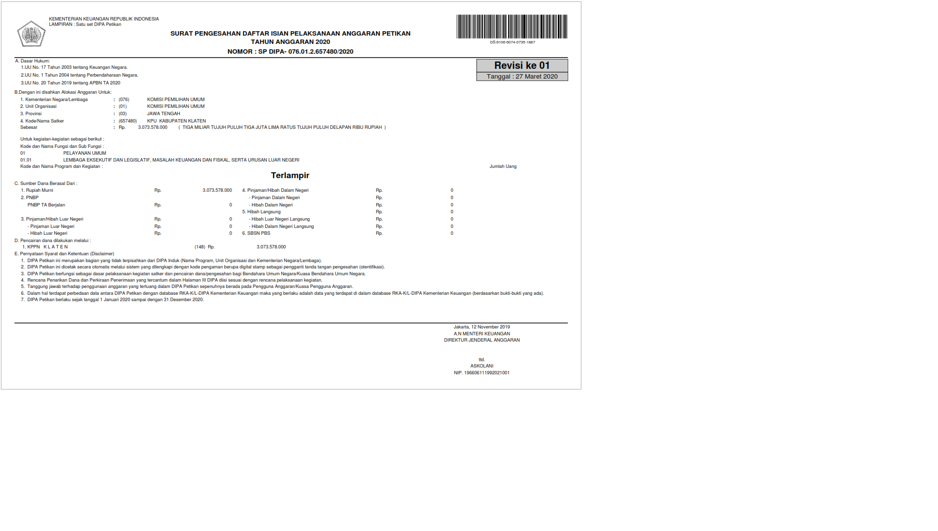 DIPA KPU Kabupaten Klaten Tahun 2020