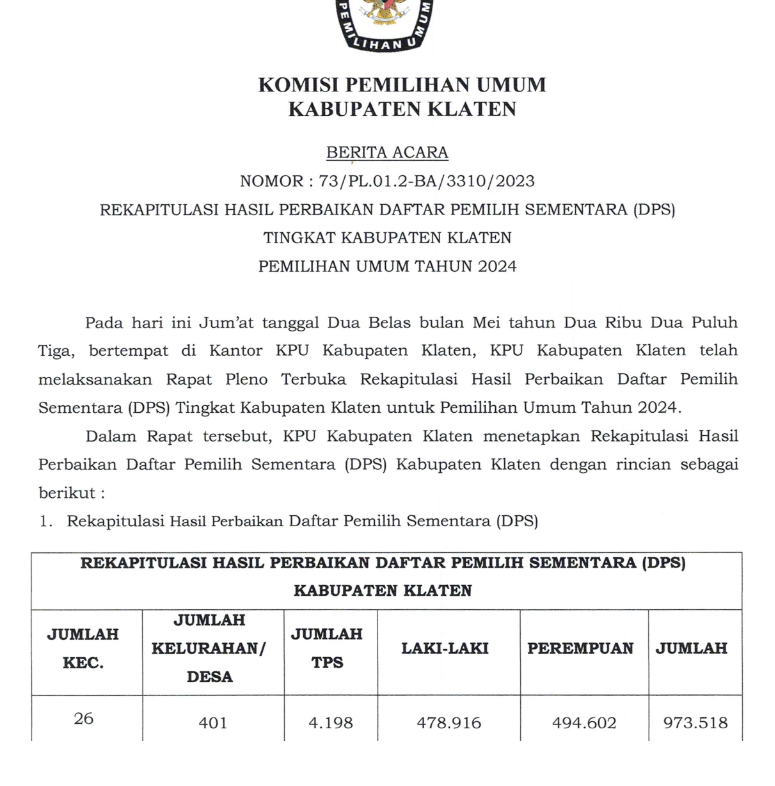 Pada hari Jumat tanggal dua belas bulan mei tahun dua ribu dua puluh tiga, KPU Kabupaten Klaten menyelenggarakan rapat pleno Reka[itulasi Perbaikan Daftar Pemilih Sementara (DPS) Pemilu Tahun 2024, yang dituangkan dalam Berita Acara nomor 73/PL.01.2-BA/3310/2023 tentang Rekapitulasi Daftar Pemilih Sementara. adapun rekapItulasi Perbaikan Daftar Pemilih Sementara dapat dilihat dan didownload [DISINI]